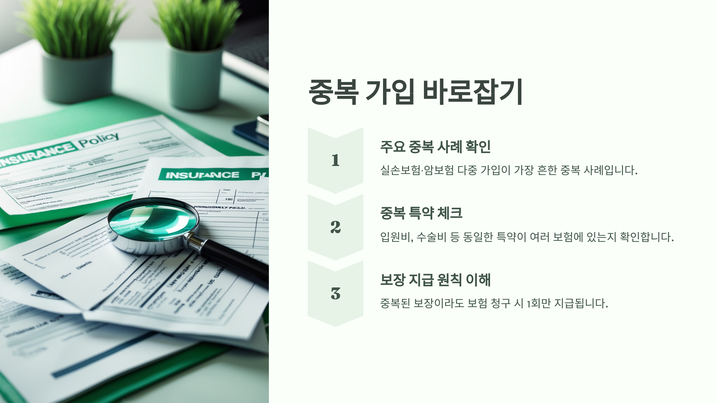 이렇게 중복 가입된 보험은 보장을 중복해서 받지 못해요. 예를 들어 실손보험은 동일한 치료에 대해 중복 보상이 되지 않아서 하나만 있어도 충분해요. 다른 보험은 헛돈만 나가는 셈이죠.