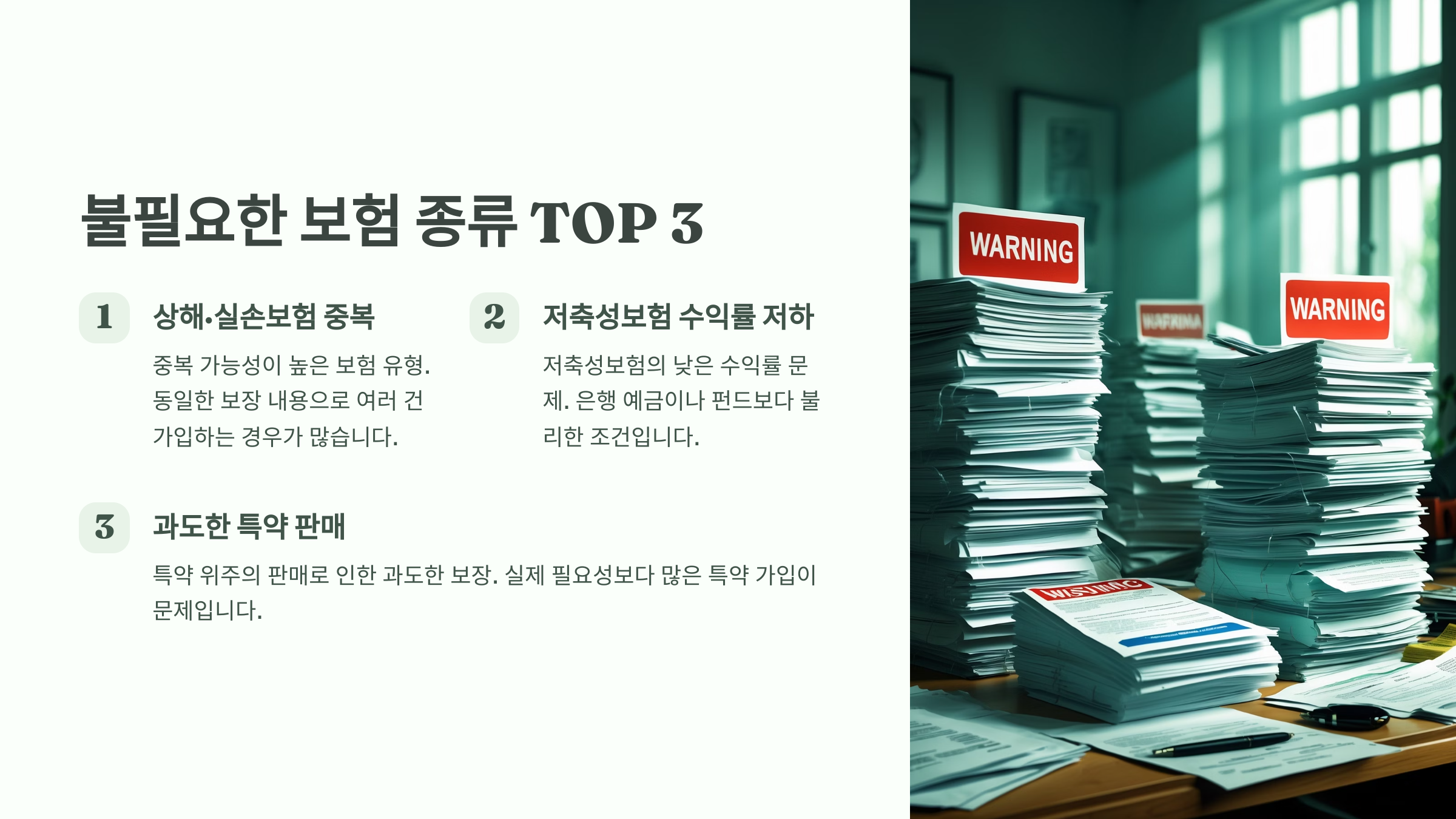 ❌ 위와 같은 보험이 있다면 조정하거나 해지 검토가 필요해요.