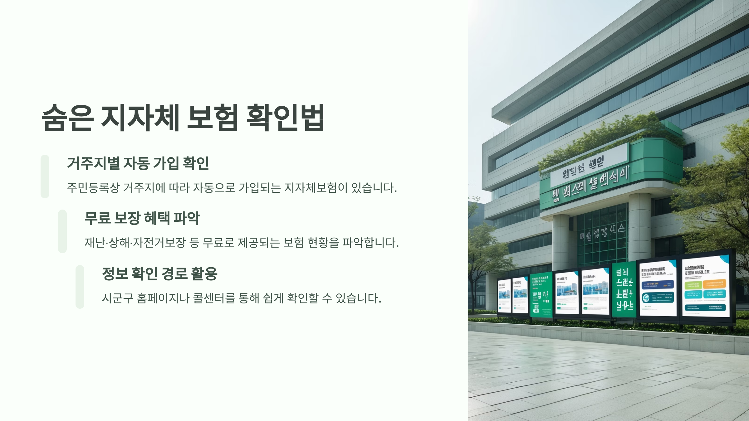 많은 사람들이 놓치고 있는 것이 바로 ‘지자체 보험’이에요. 알고 보면 각 시·군·구에서는 주민들을 위해 다양한 자동 가입 보험을 운영하고 있어요.