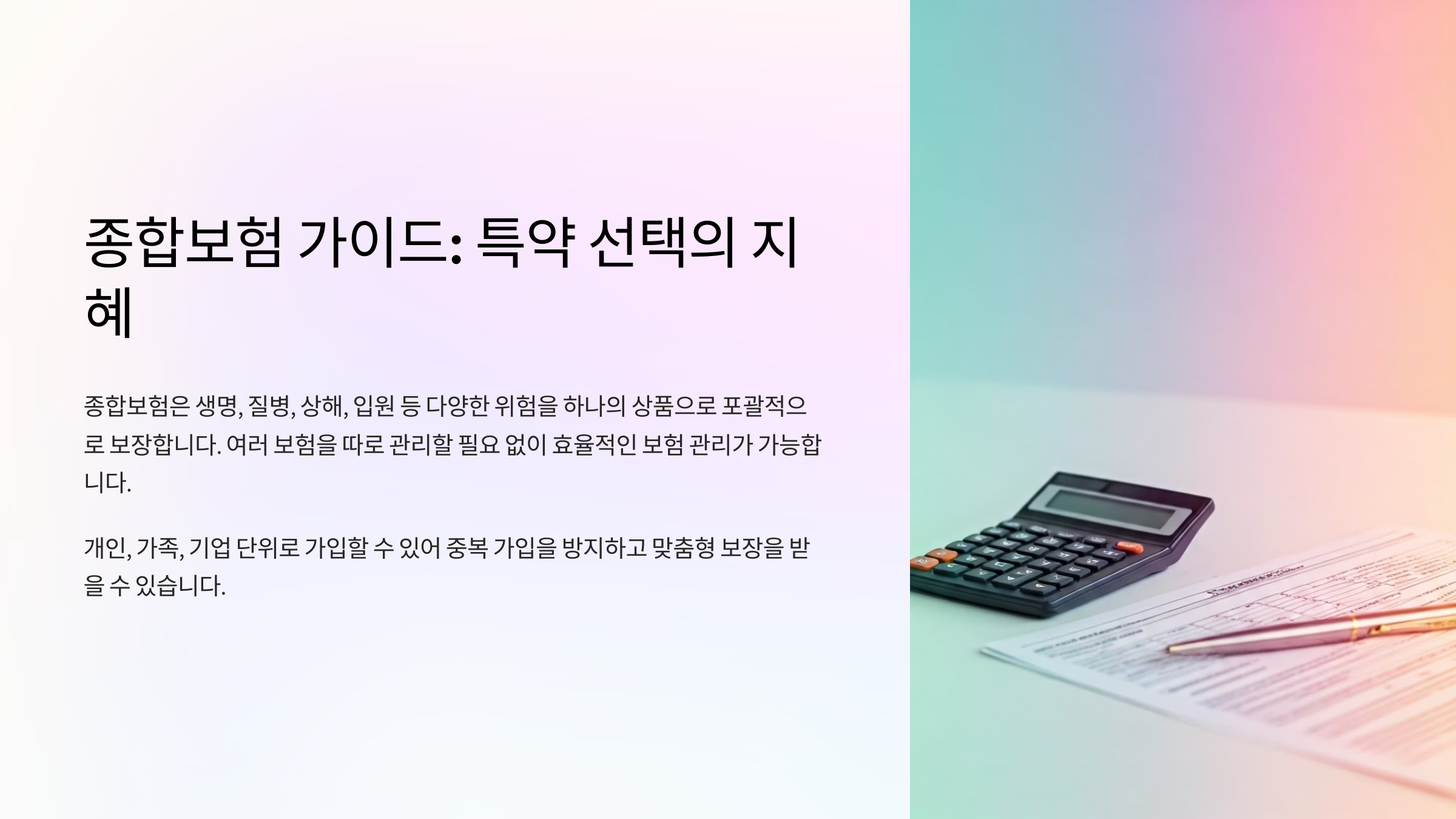 종합보험은 여러 위험 요소를 하나의 보험 상품에 묶어 보장해주는 형태예요. 기본 보장 외에 다양한 특약을 통해 보장을 확장할 수 있는 게 가장 큰 장점이죠.