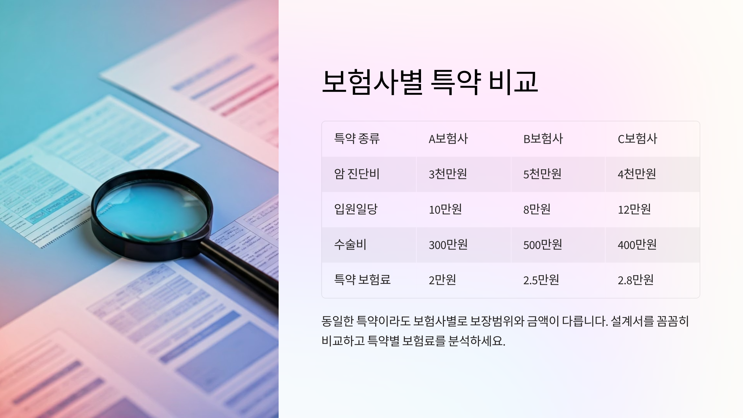 보험사마다 제공하는 특약 종류와 조건이 조금씩 달라요. 같은 이름의 특약이라도 세부 보장 내용은 천차만별이죠.