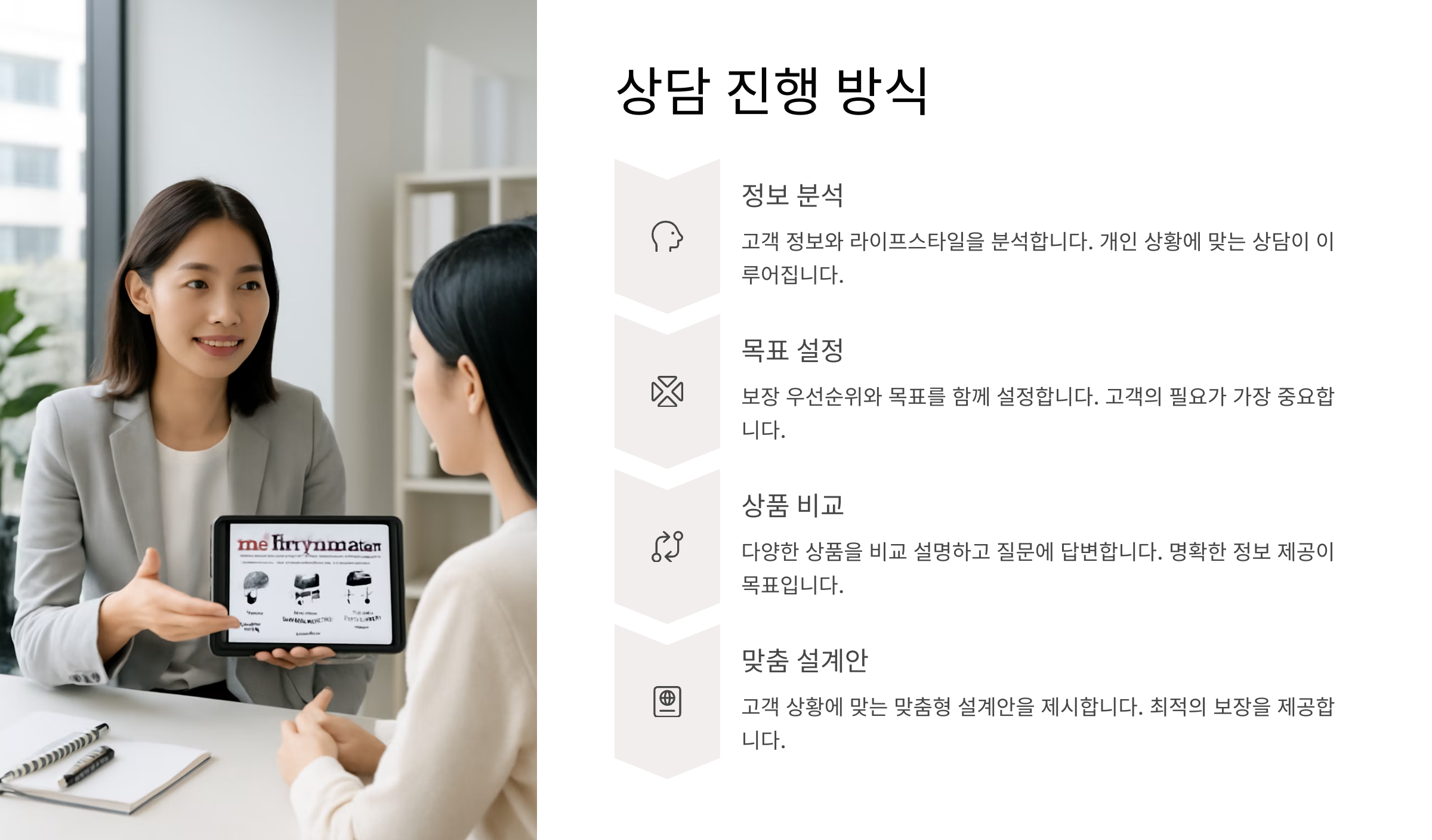 | 2단계: 현재보험 진단 | 기존 상품 점검 | 보장 누락, 중복 보장 |