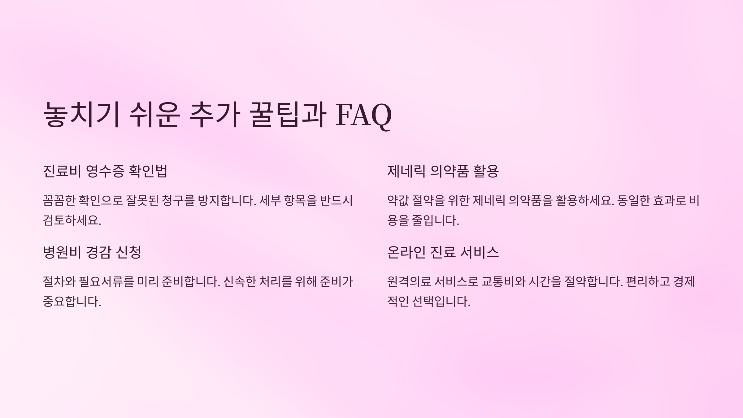 이런 꿀팁들을 하나씩 실천해보면, 부모님 병원비가 훨씬 가볍게 느껴질 거예요. 작은 습관이 큰 절약을 만든답니다 😉