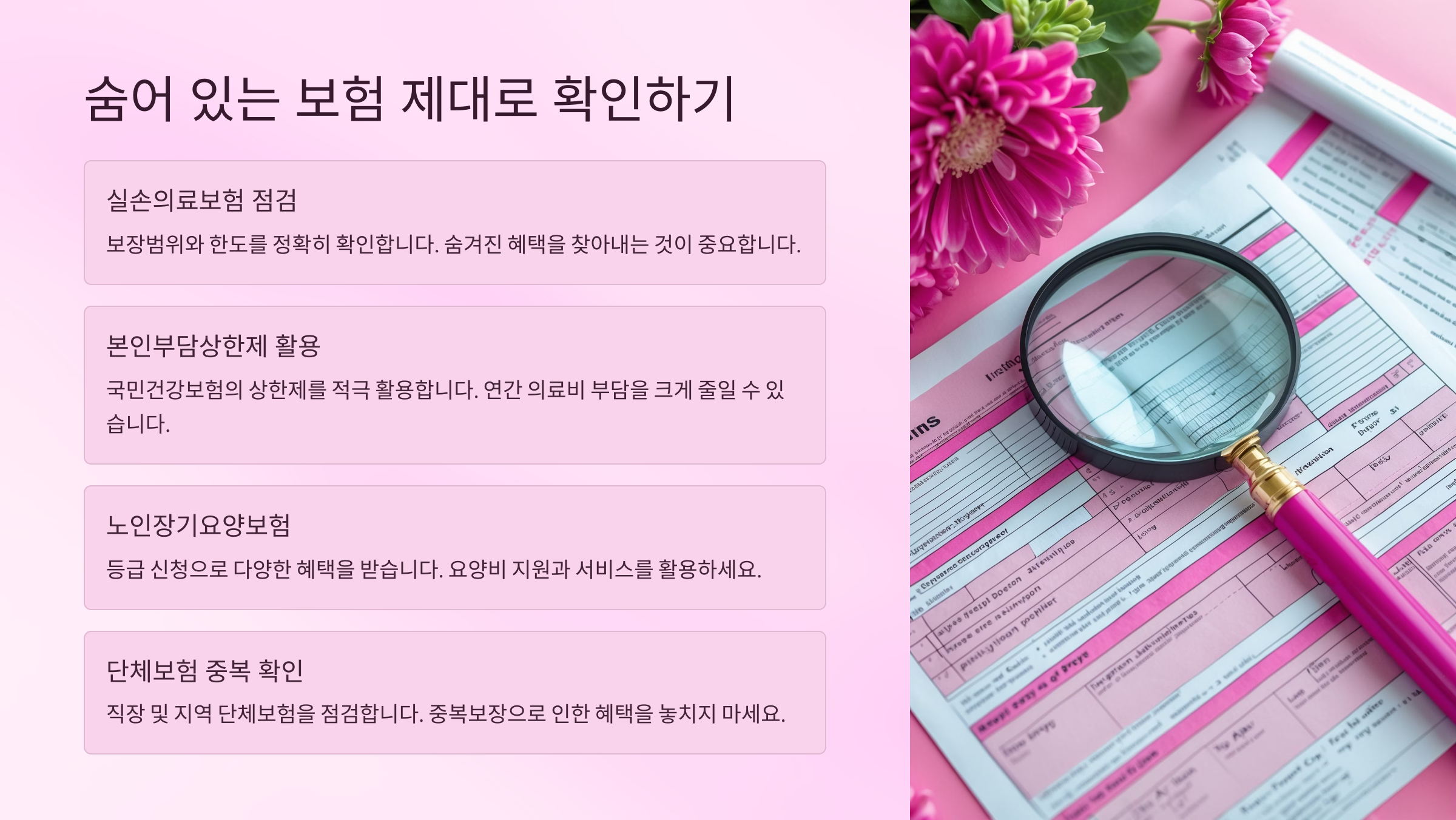 하지만 요즘은 보험과 정부 지원제도를 잘 활용하면, 병원비를 절반 이상 줄일 수 있는 방법도 많답니다. 저도 부모님 보험 리모델링을 해드린 후 매달 20만 원 가까이 아끼고 있어요.