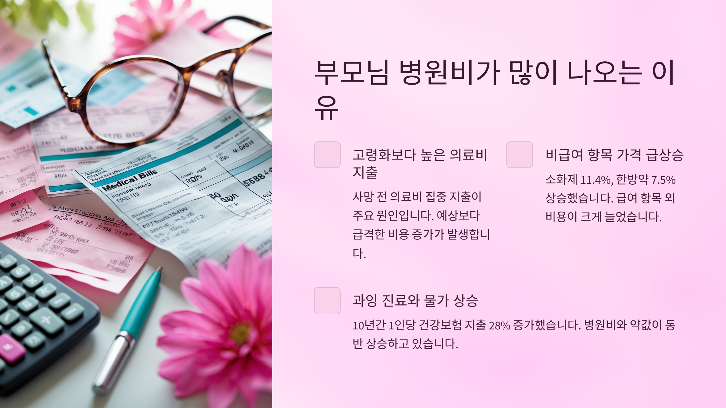 여기에 건강보험이 안 되는 비급여 항목까지 더해지면 병원 한 번 다녀오는데 10만 원 이상 쓰는 일도 흔해요. 부모님께서 "이젠 병원 무서워서 못 가겠다"고 하시는 이유가 여기에 있죠. 😥