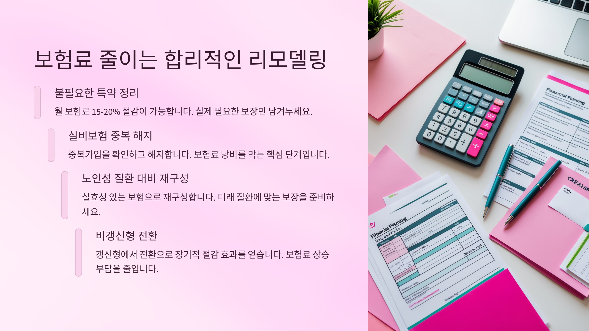 보험 리모델링은 말 그대로 '고치고, 바꾸는' 작업이에요. 하지만 보험은 건물과 달리 외형이 보이지 않아서, 전문가의 도움이 있거나 본인이 꼼꼼하게 분석해야 해요. 불필요한 특약 정리, 갱신형 여부 확인, 보험료 수준 점검이 핵심이에요.