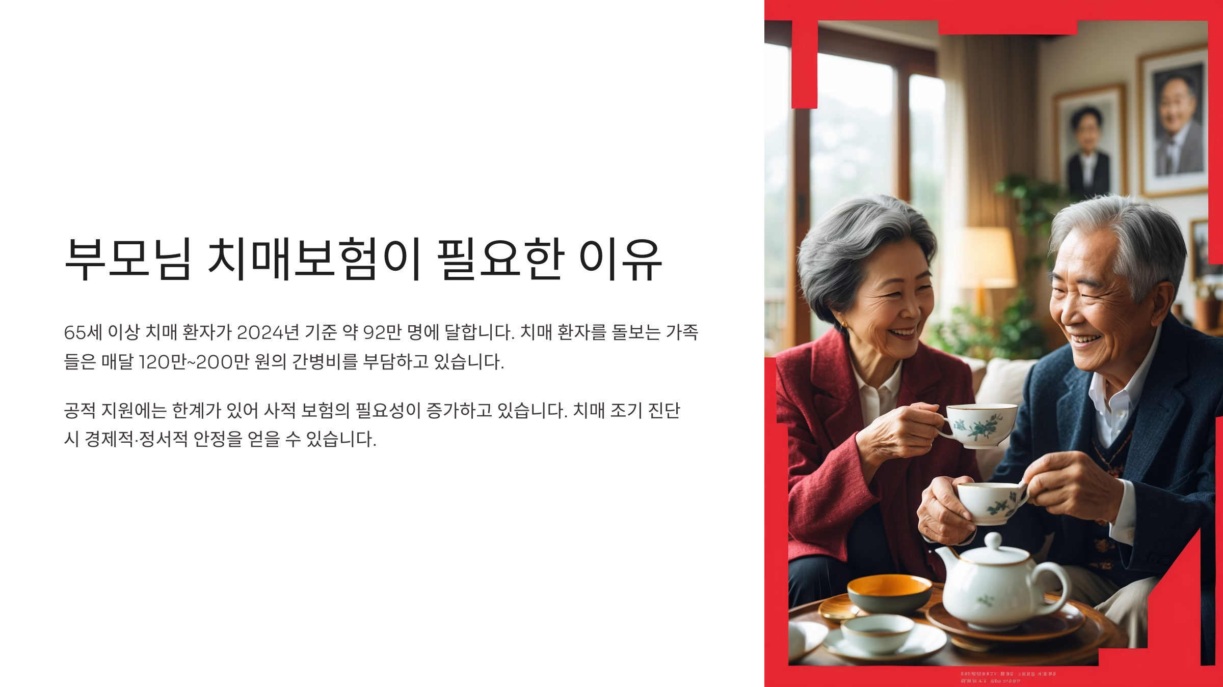 치매는 예고 없이 찾아오기에, 지금 준비하지 않으면 나중에 경제적·심리적으로 큰 부담을 안게 돼요. 부모님께 보험 하나로 든든한 울타리를 만들어드리면 정말 후회가 없을 거예요. 💪