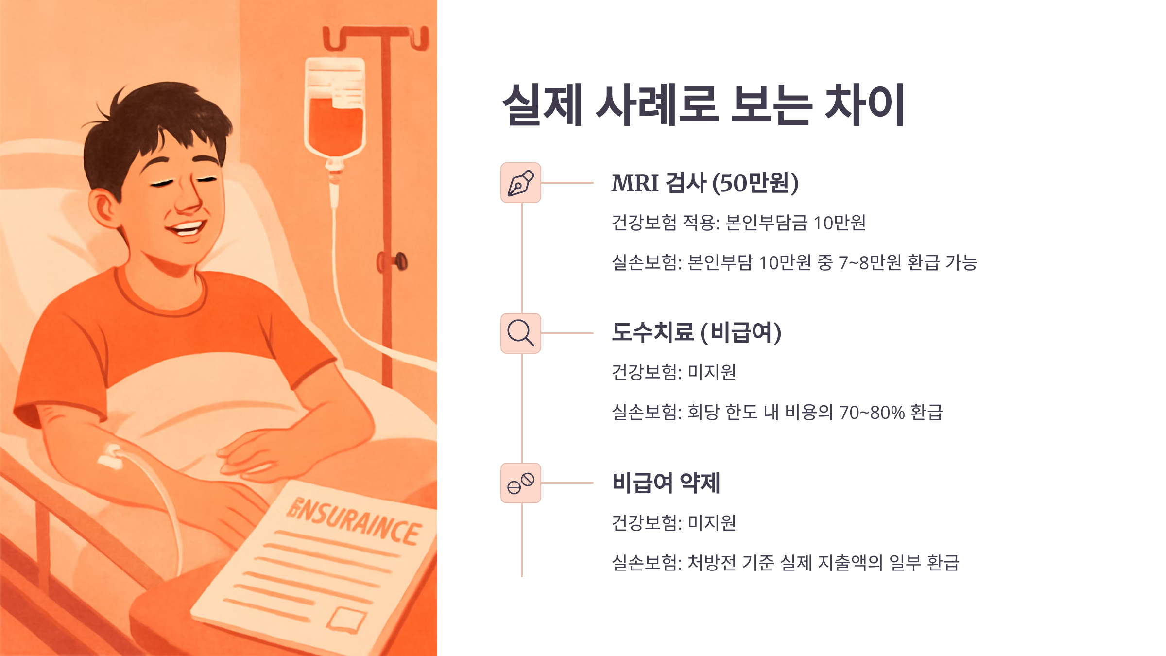 이론만으로는 실손보험과 건강보험의 차이를 완전히 이해하기 어려워요. 그래서 실제 사례를 통해 어떤 차이가 생기는지 확인해볼게요. 상황에 따라 두 보험이 각각 어떻게 작동하는지를 비교하면 훨씬 쉽게 와닿을 거예요.