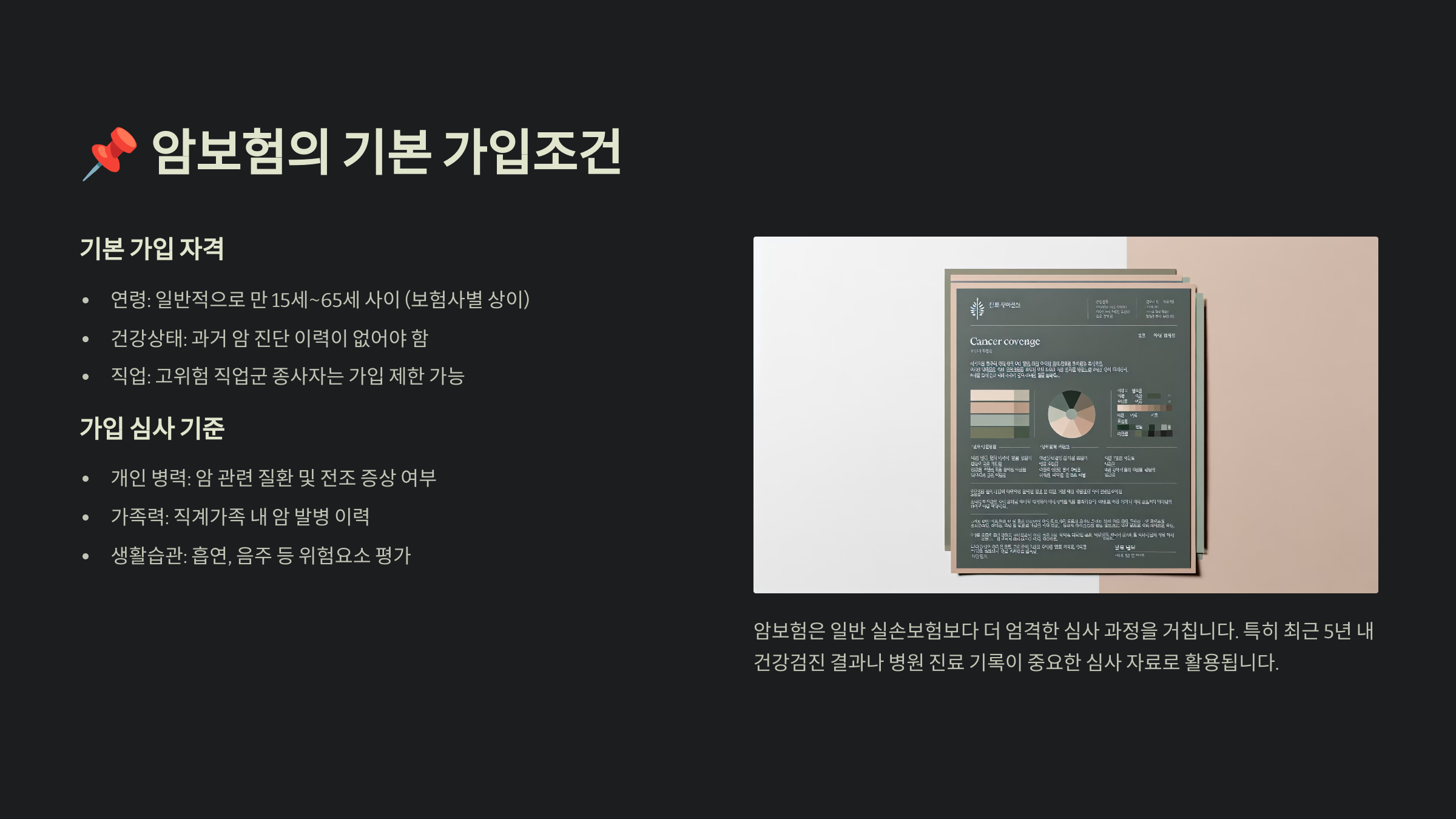 조건만 잘 이해하고 준비하면, 암보험은 든든한 미래 대비책이 될 수 있어요! 🤝