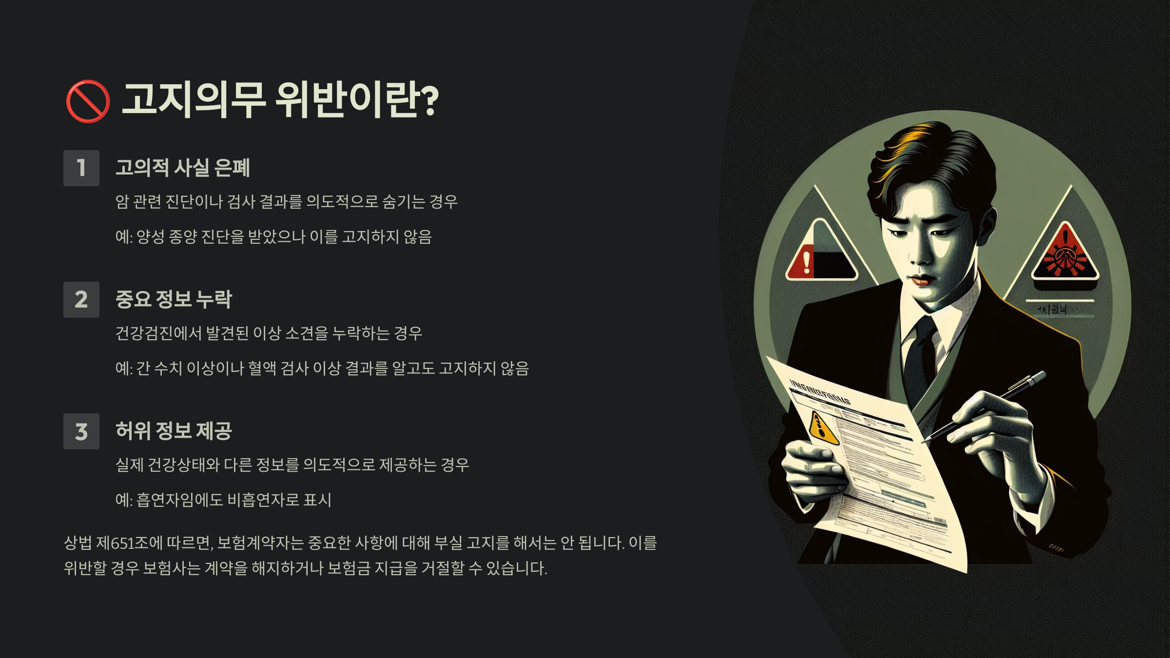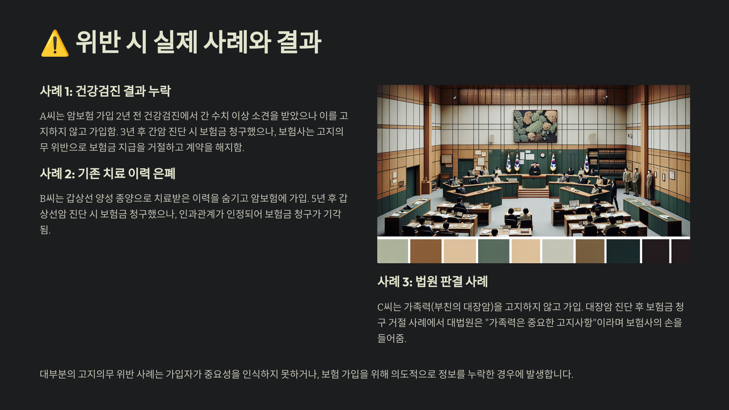 암보험 가입 시 고지의무를 위반하면 어떤 결과가 나타날까요? 이론만 보면 와닿지 않을 수 있지만, 실제 사례들을 보면 "절대 고의든 실수든 절대 빠뜨려선 안 된다!"는 걸 피부로 느끼게 돼요. 오늘은 고지의무를 위반한 사례들과 그로 인해 어떤 피해가 있었는지 구체적으로 알려드릴게요. 👀