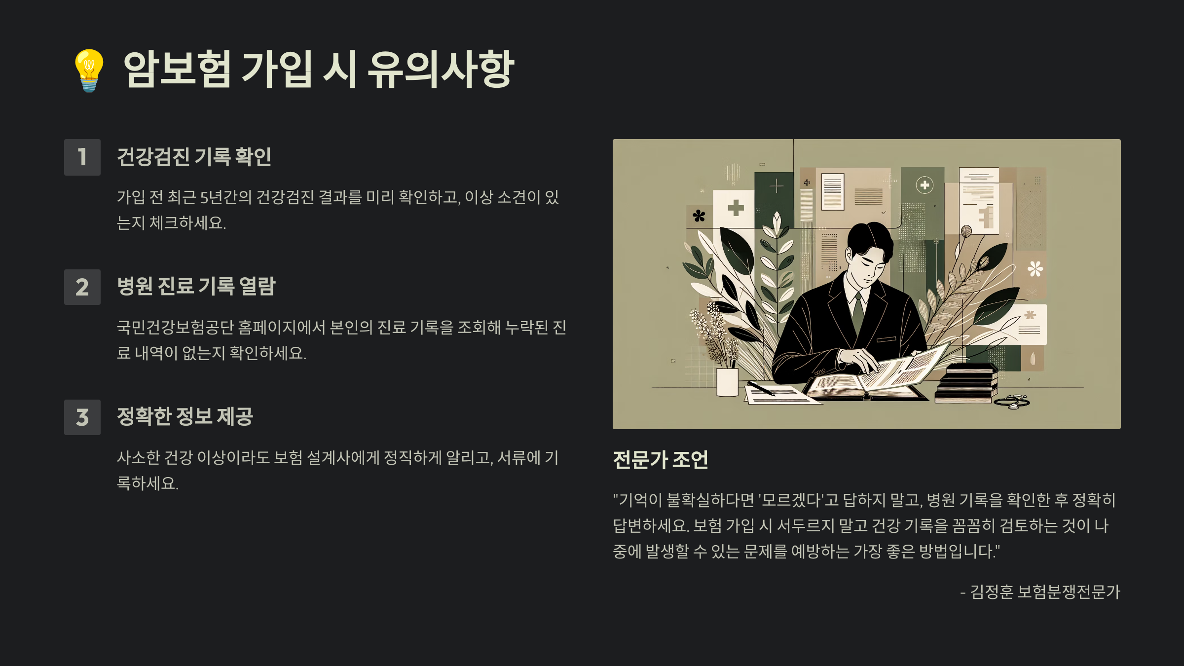 이처럼 사소한 누락이 돌이킬 수 없는 결과로 이어질 수 있어요. "내 건강이니까 내가 제일 잘 알아"라는 생각보다는, "보험사와 투명하게 소통하자"는 자세가 훨씬 안전하답니다.