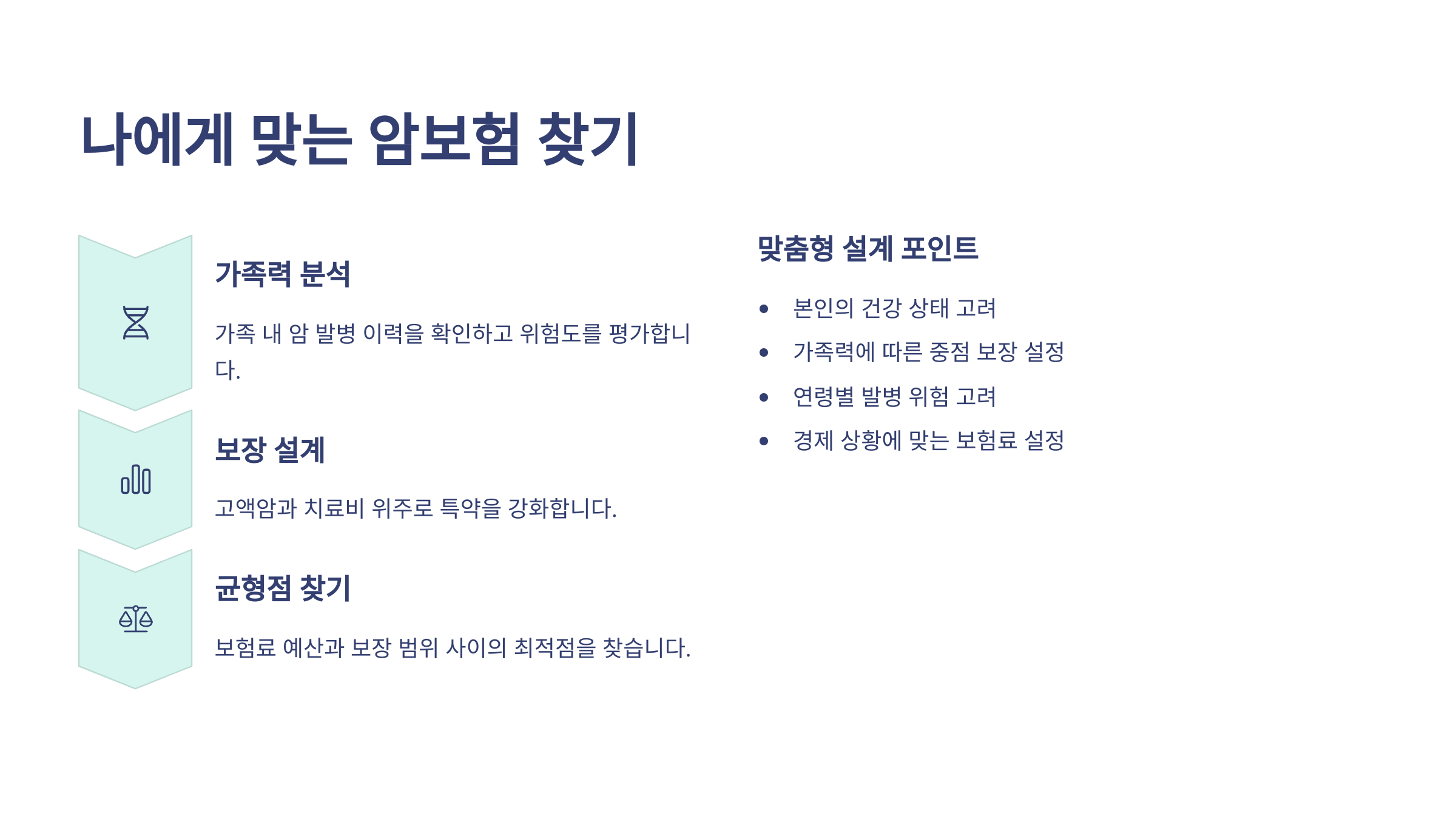 암보험은 단순히 "좋은 상품"을 찾는 게 아니라, "나에게 맞는 상품"을 찾는 게 핵심이에요. 사람마다 나이도 다르고 가족력, 직업, 건강 상태도 다르기 때문에 같은 상품이 모두에게 좋을 수는 없어요.