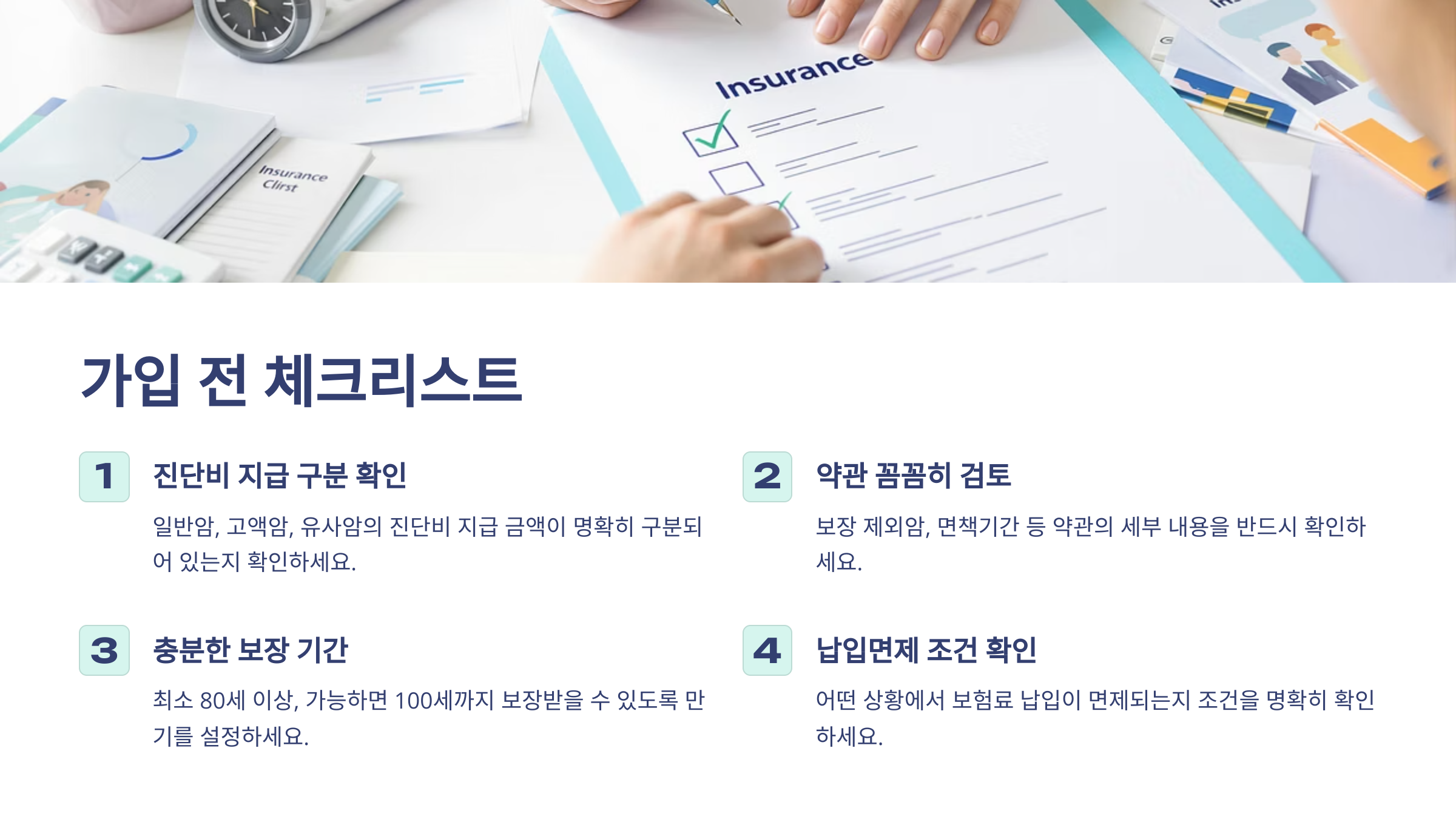 💡 암보험을 가입할 때는 반드시 내가 우선적으로 필요로 하는 보장 항목이 빠지지 않았는지를 꼼꼼히 확인해보세요! 암보험의 차이는 결국 디테일에서 갈려요.