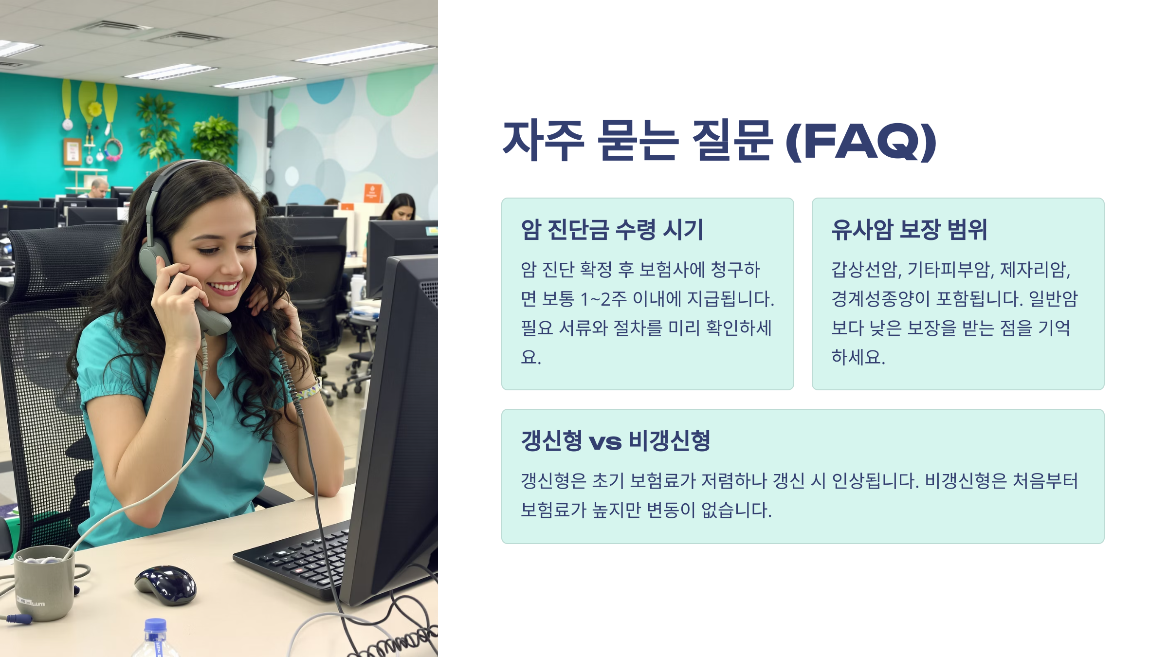 이 외에도 갱신 여부와 납입면제 조건도 체크해야 해요. 암 진단 시 이후 보험료를 면제받을 수 있다면 치료와 회복에만 집중할 수 있겠죠? 납입면제는 꼭 챙겨야 할 기능이에요.
