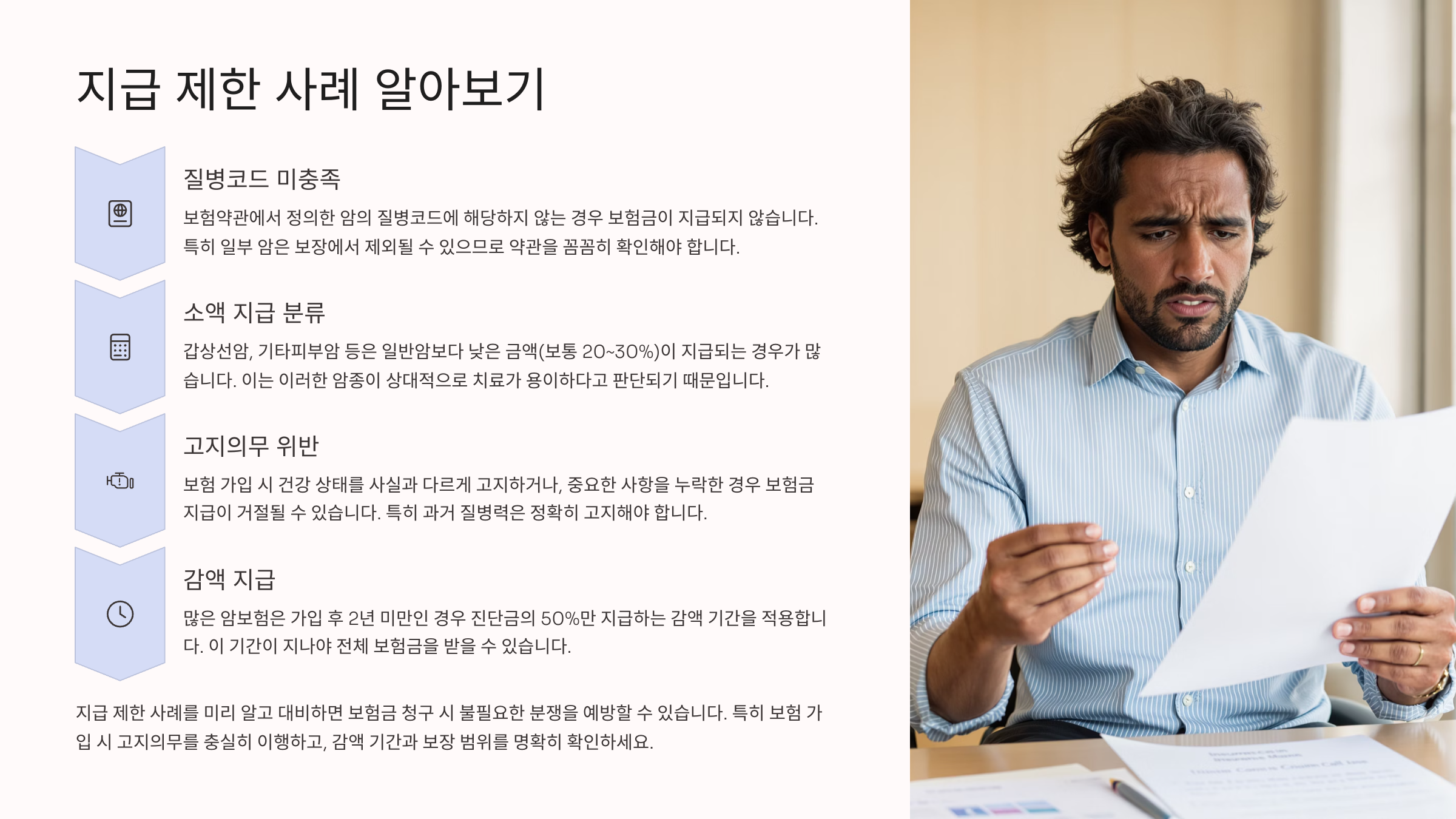 보험 계약자 입장에서는 '지급 제한' 조항을 반드시 미리 파악해야만, 나중에 분쟁을 피할 수 있어요.