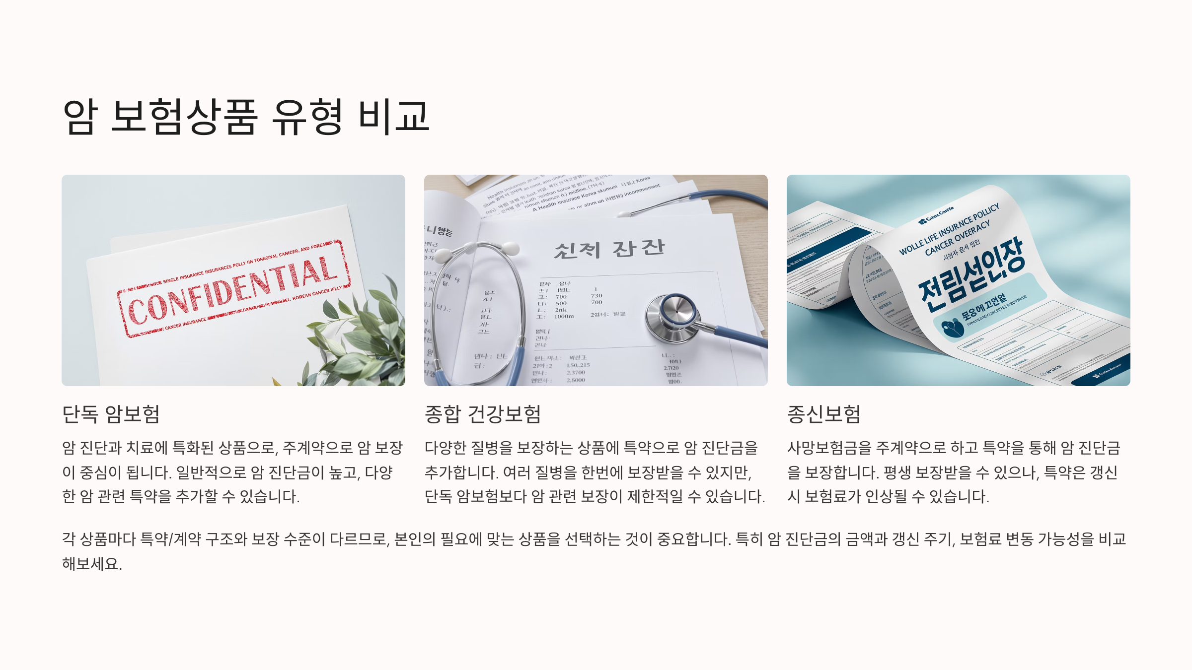 셋째는 **암 종류별로 분리 보장되는 상품을 선택**하는 거예요. 예를 들어 ‘고액암’, ‘소액암’, ‘재진단암’ 각각 보장받을 수 있는지를 체크해야 해요.