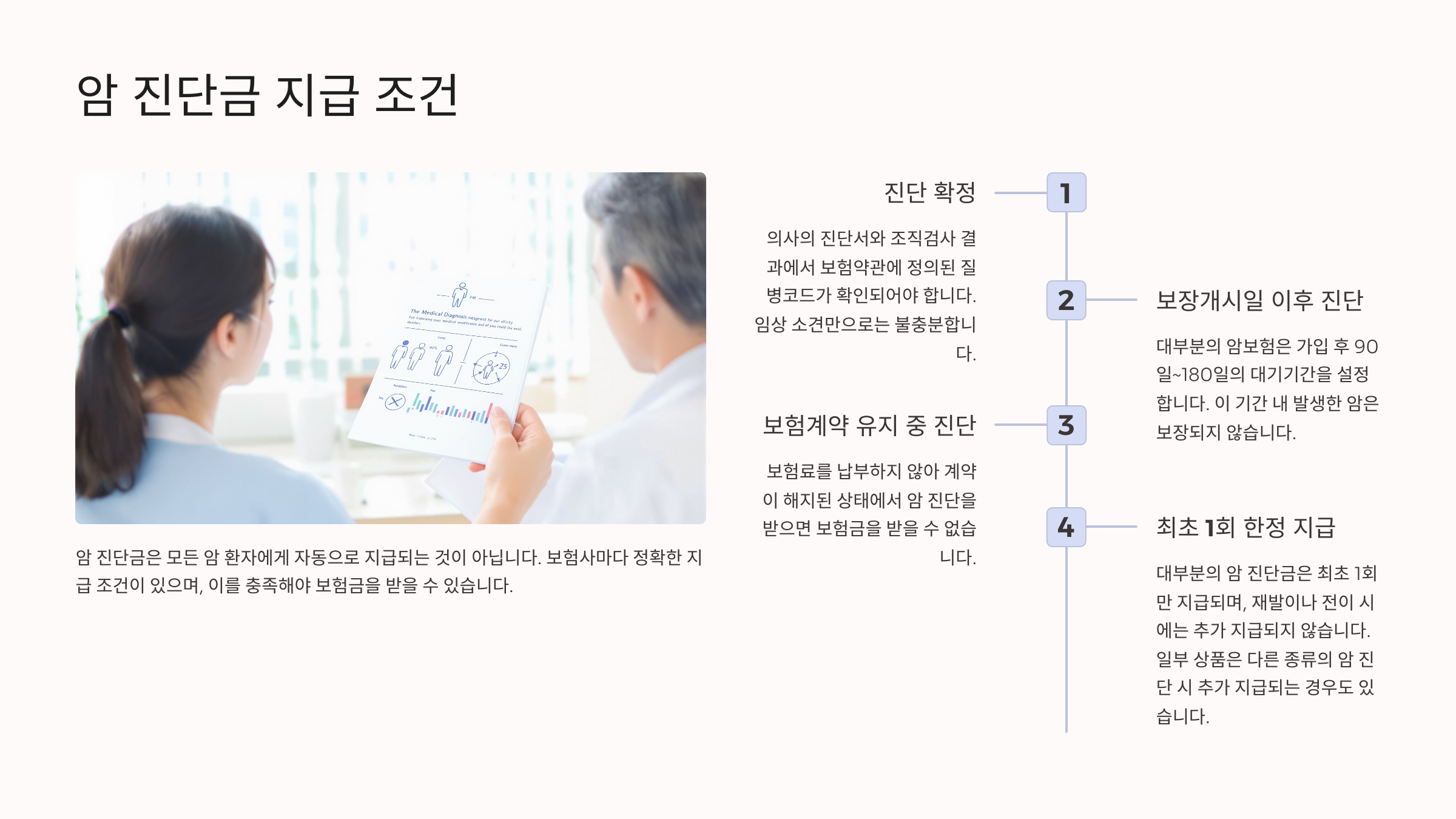 이처럼 보험금 지급은 단순히 암 진단만으로 이루어지지 않고, 상품 약관과 진단 조건, 제출 서류 등 복합적인 요소를 충족해야 해요.