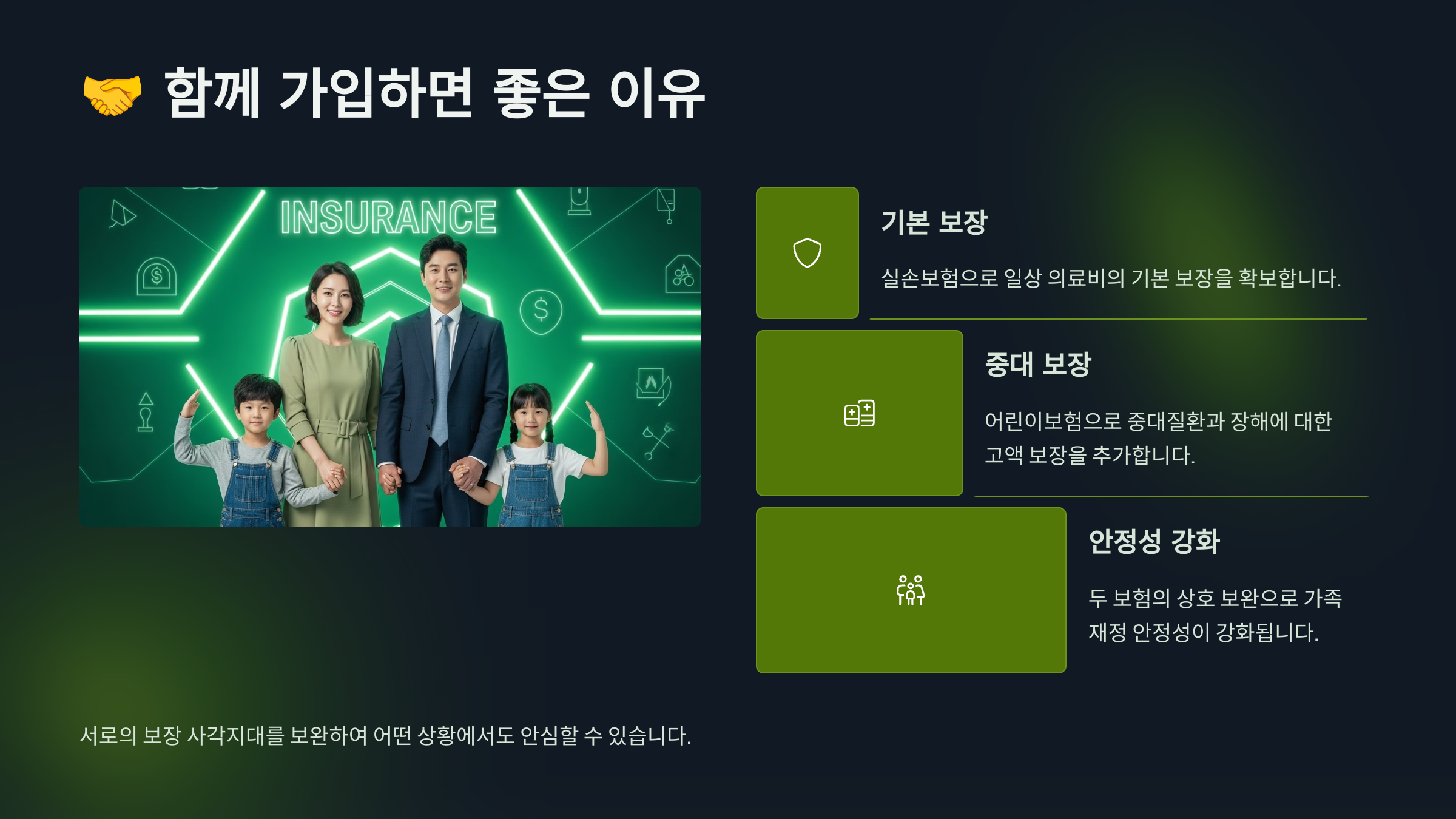 두 보험은 겹치는 부분도 있지만, 동시에 보완적인 관계에 있어요. 어린이보험은 ‘미래 큰 질병’ 대비용이라면, 실손보험은 ‘일상적인 병원비’ 대비용이에요. 이 둘을 함께 갖추면 훨씬 탄탄한 보장 구성이 되죠.