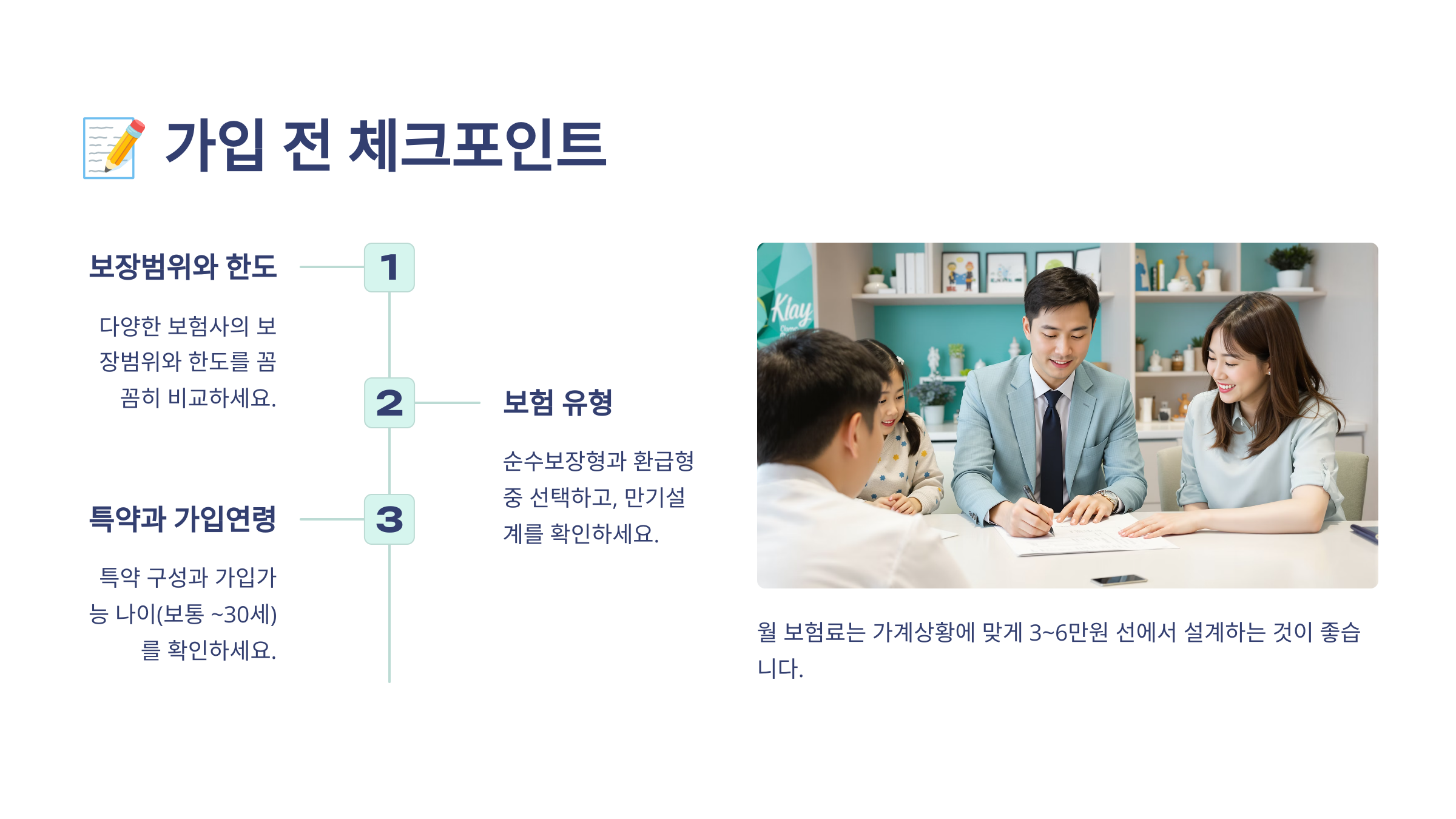 어린이보험을 설계할 때 단순히 진단금과 입원비만 비교하면 안 돼요. 실제 보장을 제대로 받기 위해서는 몇 가지 꼭 확인해야 할 체크포인트들이 있답니다. 보험은 평생 가는 계약일 수 있으니, 꼼꼼하게 따져보는 게 정말 중요해요!