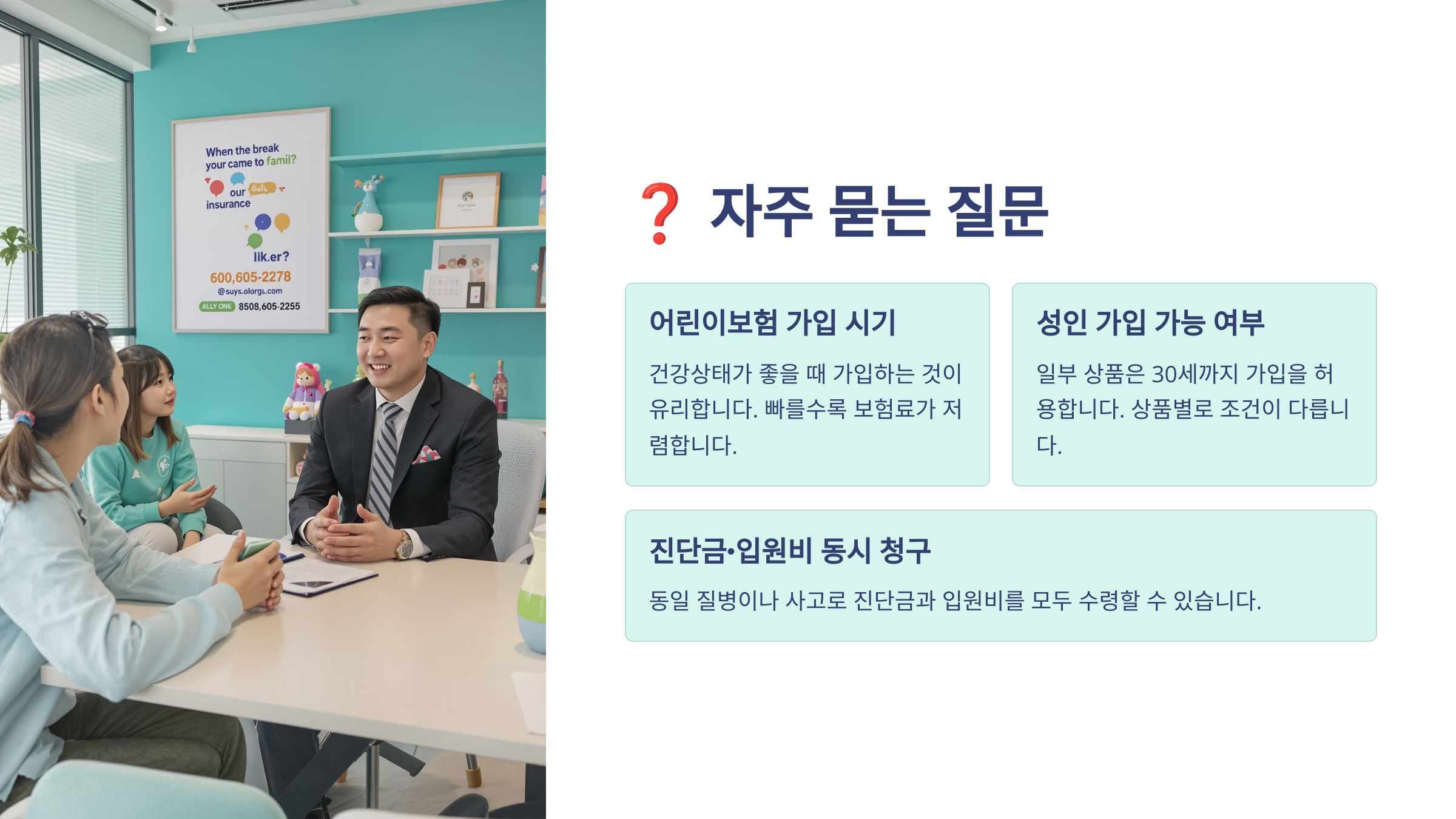 A1. 출생 직후 가입하는 게 가장 유리해요. 병력이나 건강 이슈가 생기기 전이기 때문에 가입 거절이나 조건 제한 없이 최대한 넓은 보장을 받을 수 있어요.