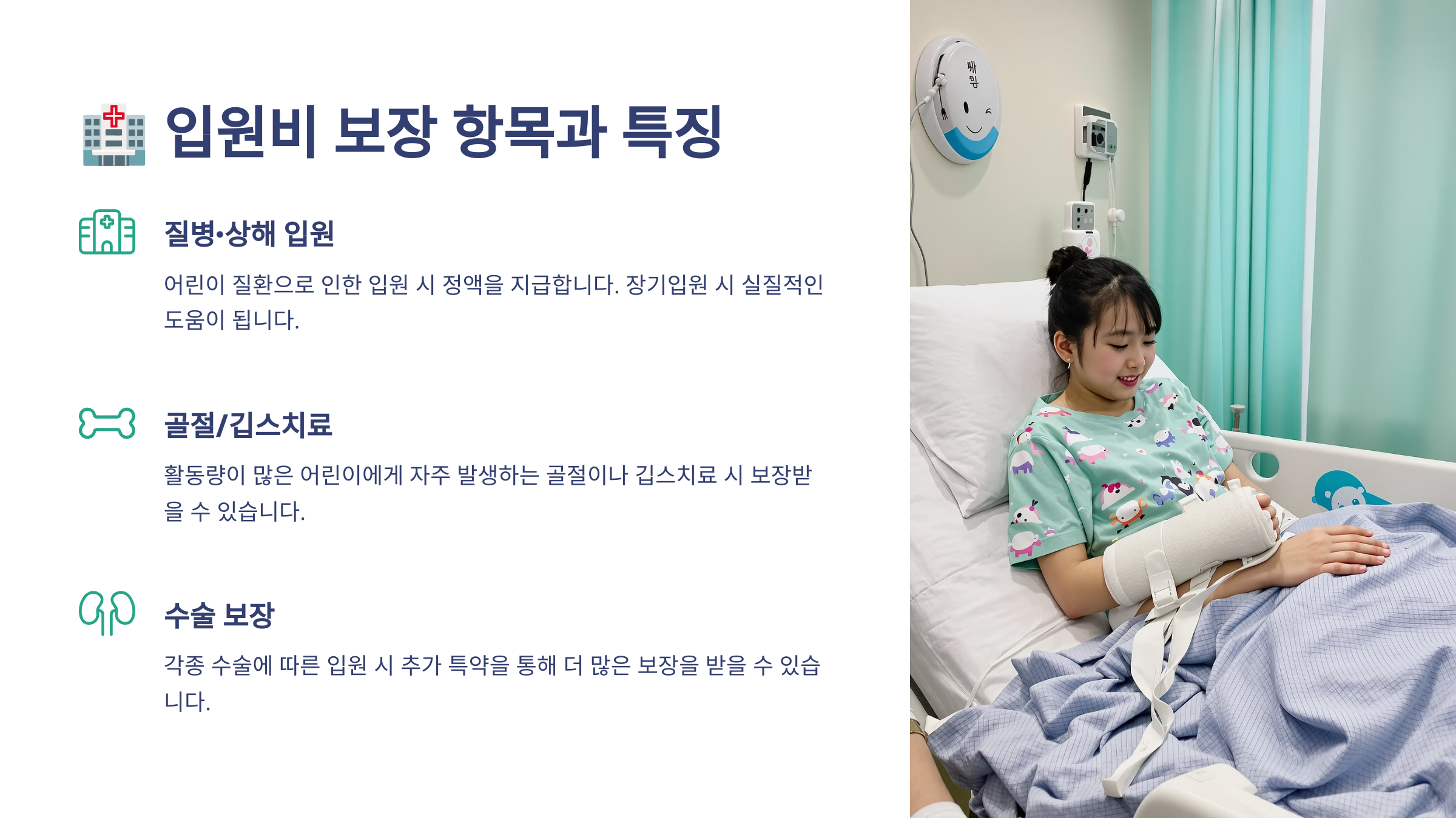 아이들은 면역력이 약해서 계절성 질병에 자주 걸리고, 넘어지거나 다치는 일도 흔하잖아요. 이런 사고로 병원에 입원하게 되면 입원비 보장이 큰 역할을 해요. 단기적인 병원비 부담을 줄여주고, 보호자의 간병비나 간식비처럼 눈에 보이지 않는 비용까지 어느 정도 보완해줘요.