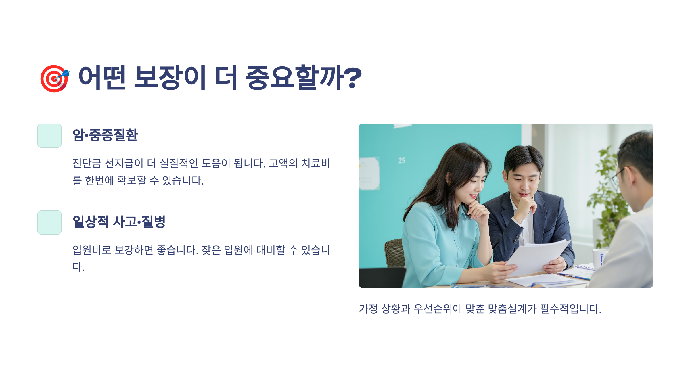 진단금과 입원비 모두 중요하지만, 실제 보험을 설계할 때는 어떤 보장에 더 비중을 두어야 할지 고민되죠? 결론부터 말하자면 ‘아이의 건강상태’와 ‘가정의 재정 상황’에 따라 달라져요. 정답은 없지만, 방향성은 분명히 있어요.
