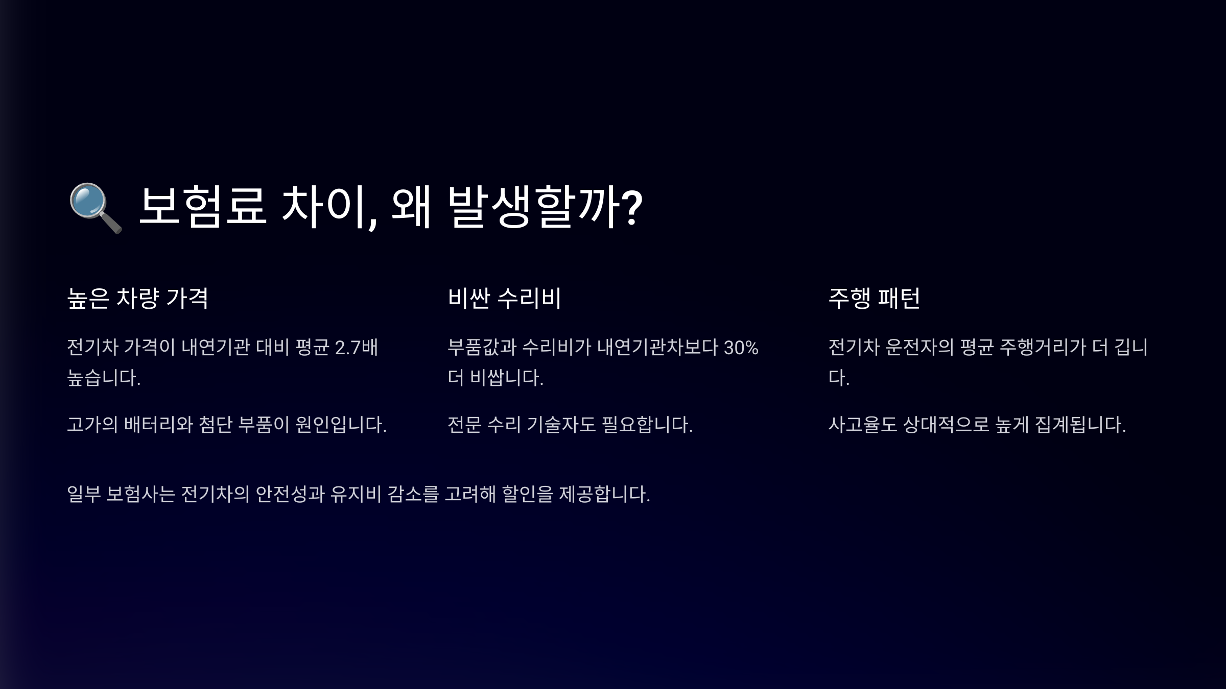 세 번째는 ‘정비 인프라의 차이’예요. 전기차를 전문적으로 수리할 수 있는 공업사가 아직은 제한적이에요. 수리 가능한 지역이 한정되어 있다 보니 보험사에서는 사고 발생 시 견인비와 수리비가 상승할 가능성을 고려하게 돼요.