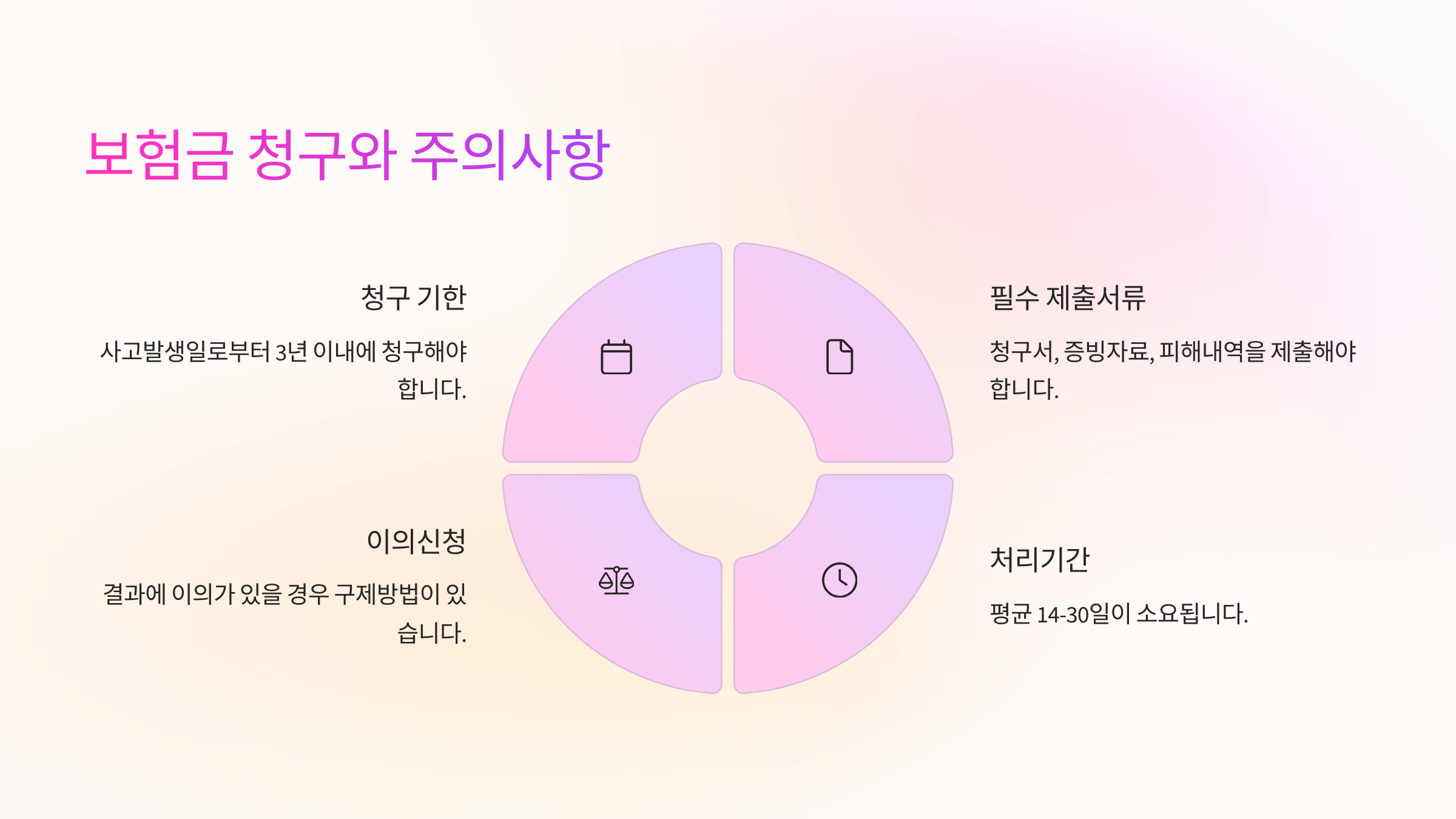또한, 보험금을 받기 전에는 해당 사고가 보험에서 보장하는 범위에 맞는지 다시 확인하는 것이 좋아요. 보장 범위 외의 사고나 피해는 보상이 안 될 수 있으니까, 꼼꼼히 확인하고 문의해보세요!