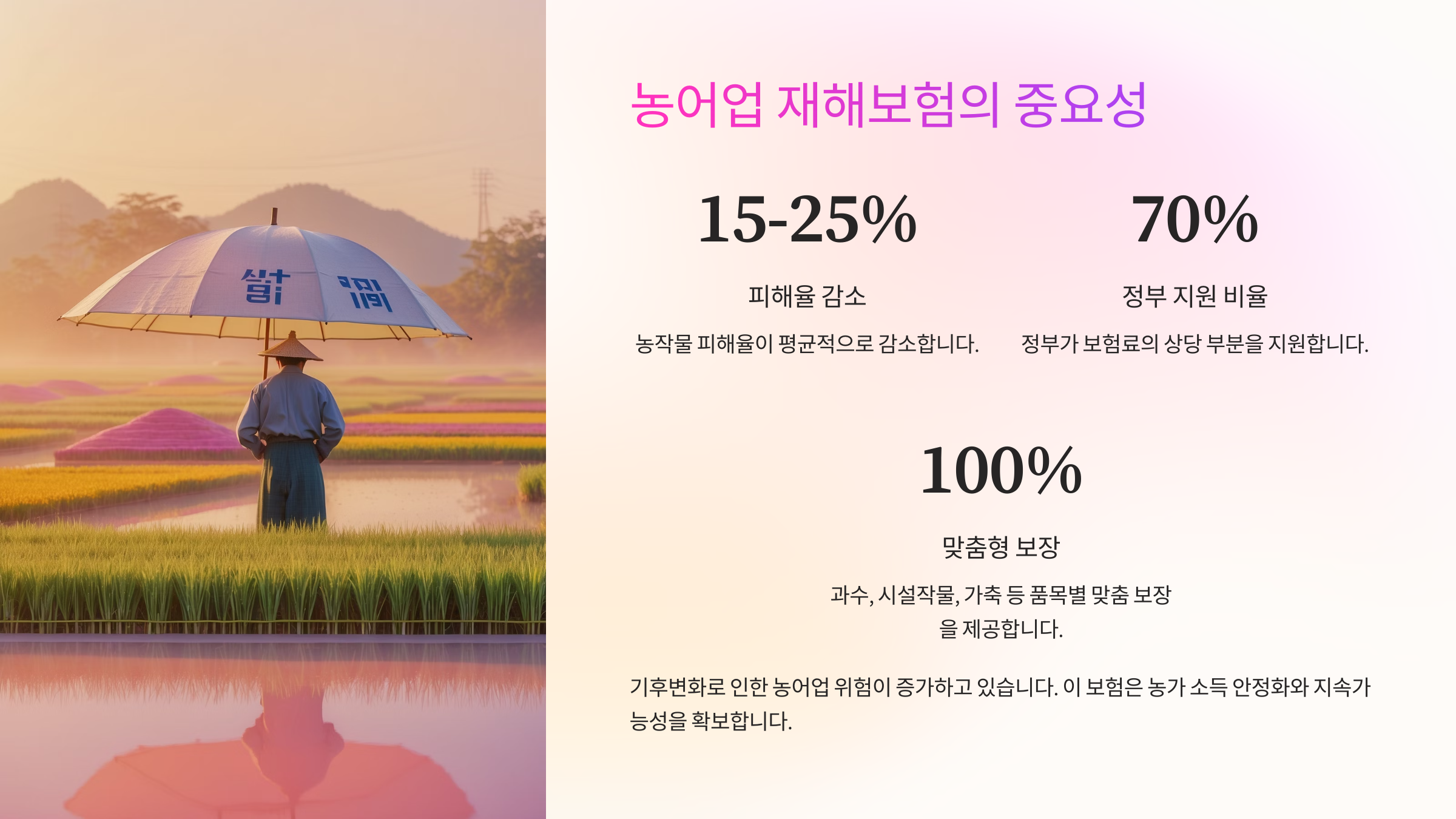 보험 덕분에, 예기치 못한 재해로 인한 손실에도 다시 도전할 수 있는 용기를 얻는 분들이 많답니다. 농어업이야말로 우리의 식탁을 책임지는 중요한 산업이니까요! 🍚