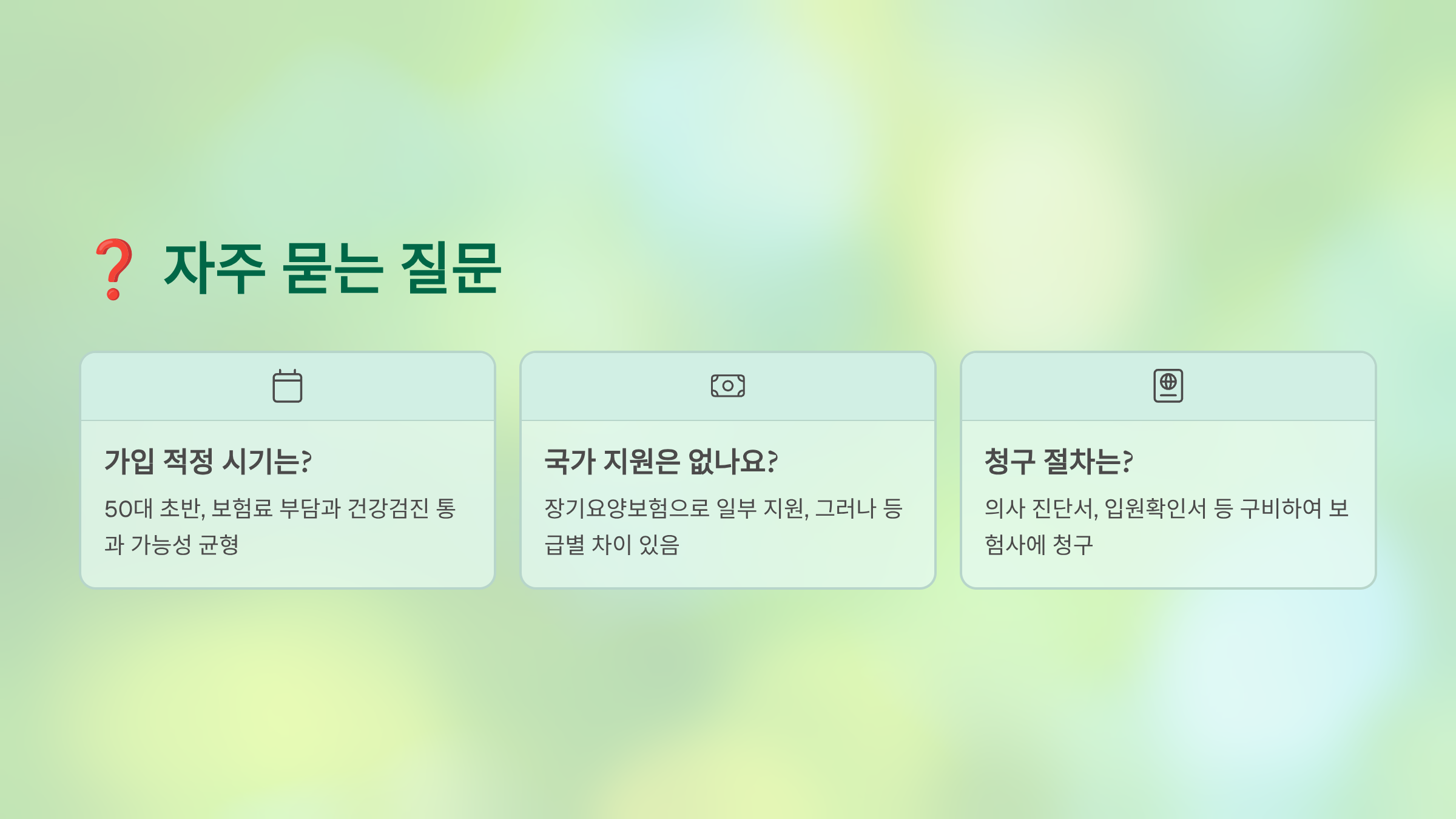 특히 70대 이상은 가입 심사 자체가 까다롭기 때문에, 가능한 한 60대 초반이나 50대에 준비하는 것이 좋아요. 현재는 50대 중반까지 가입 가능한 상품이 많고, 상대적으로 보험료도 부담이 덜해요.