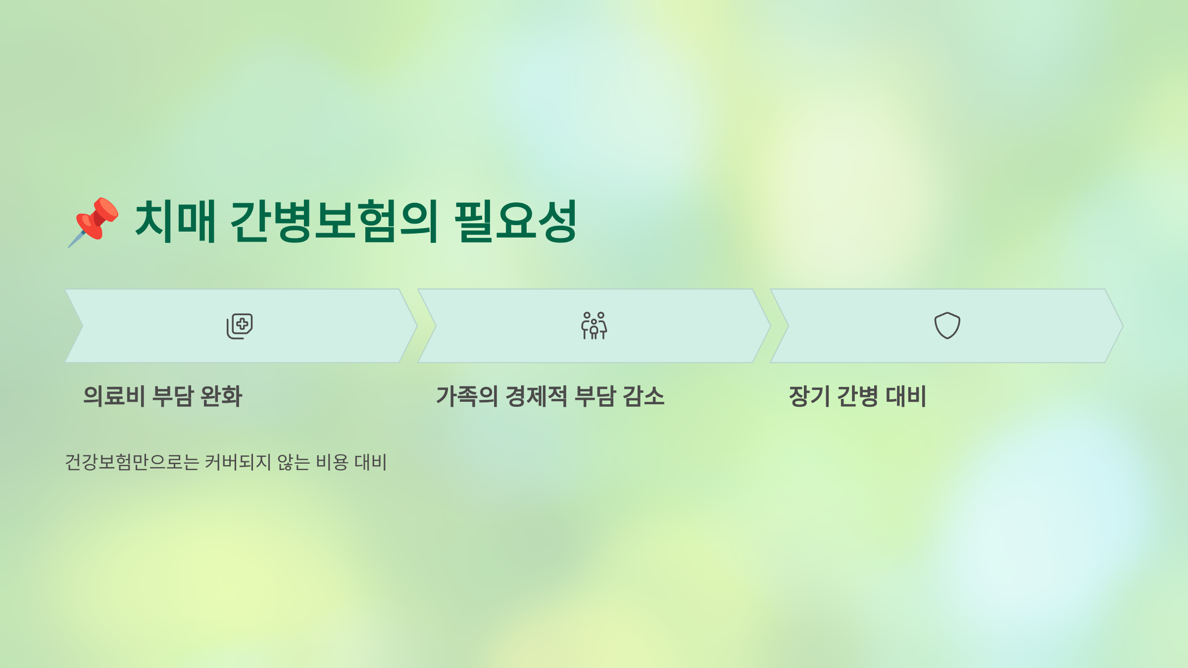치매 간병보험은 말 그대로 ‘미래에 대비하는 보험’이에요. 치매는 한 번 발병하면 수년간 돌봄이 필요하고, 회복이 거의 불가능한 경우가 많아요. 그래서 미리 준비하지 않으면 재정 파탄까지 이어질 수 있어요.