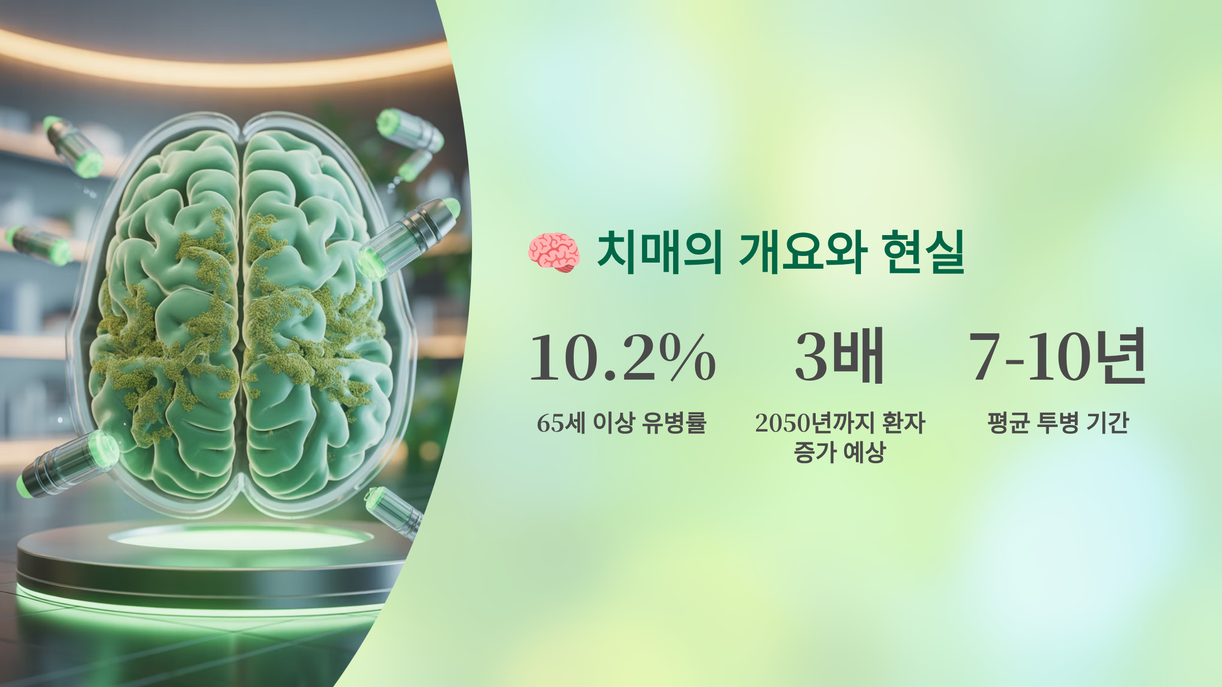 2025년 기준 국내 65세 이상 인구는 약 1,000만 명으로 추정되며, 그중 약 100만 명이 치매를 앓고 있어요. 게다가 초기 증상을 놓치기 쉬워 적절한 시기에 치료를 받지 못하는 경우도 많아요.