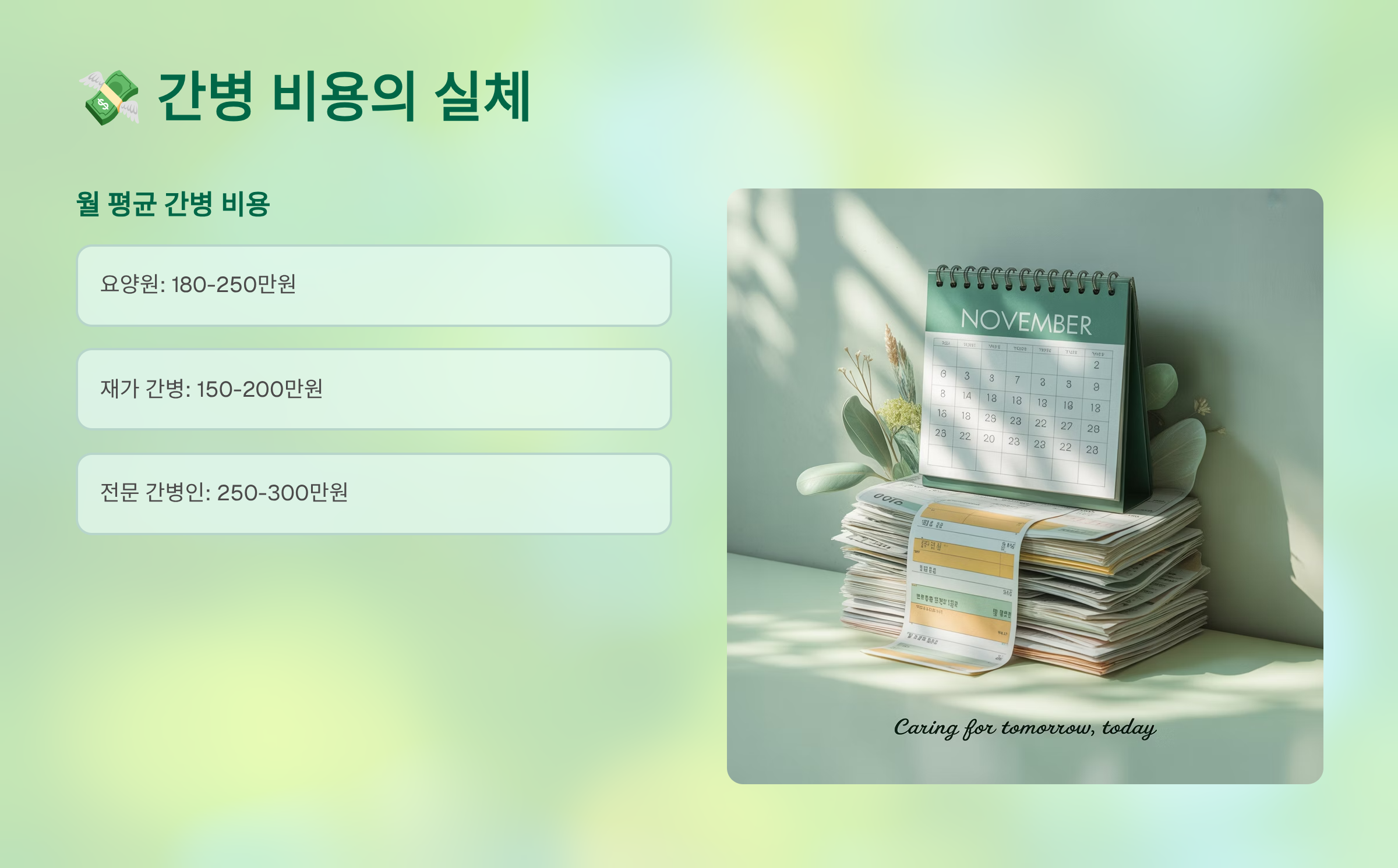 2025년 현재 기준으로 간병인 비용은 하루 10~15만 원 수준이에요. 월 단위로 보면 최소 300만 원 이상이 필요하다는 뜻이죠. 여기에 병원비, 약값, 교통비까지 합치면 월 400만 원 이상이 들어갈 수 있어요.