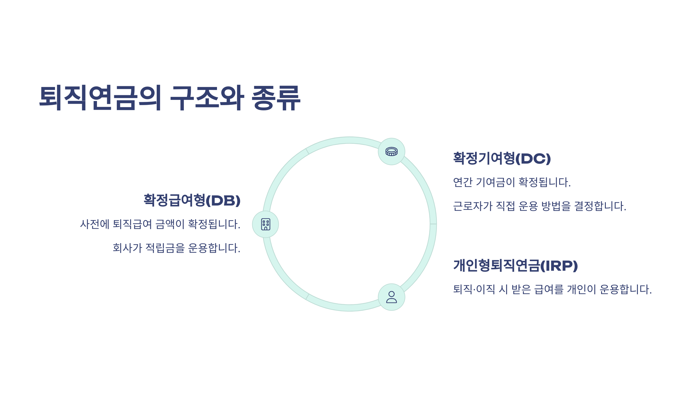 퇴직연금은 크게 세 가지 종류로 나뉘어요. DB형, DC형, 그리고 IRP라는 형태죠. 각각의 구조는 운용 주체와 책임 방식에 따라 완전히 다르답니다.