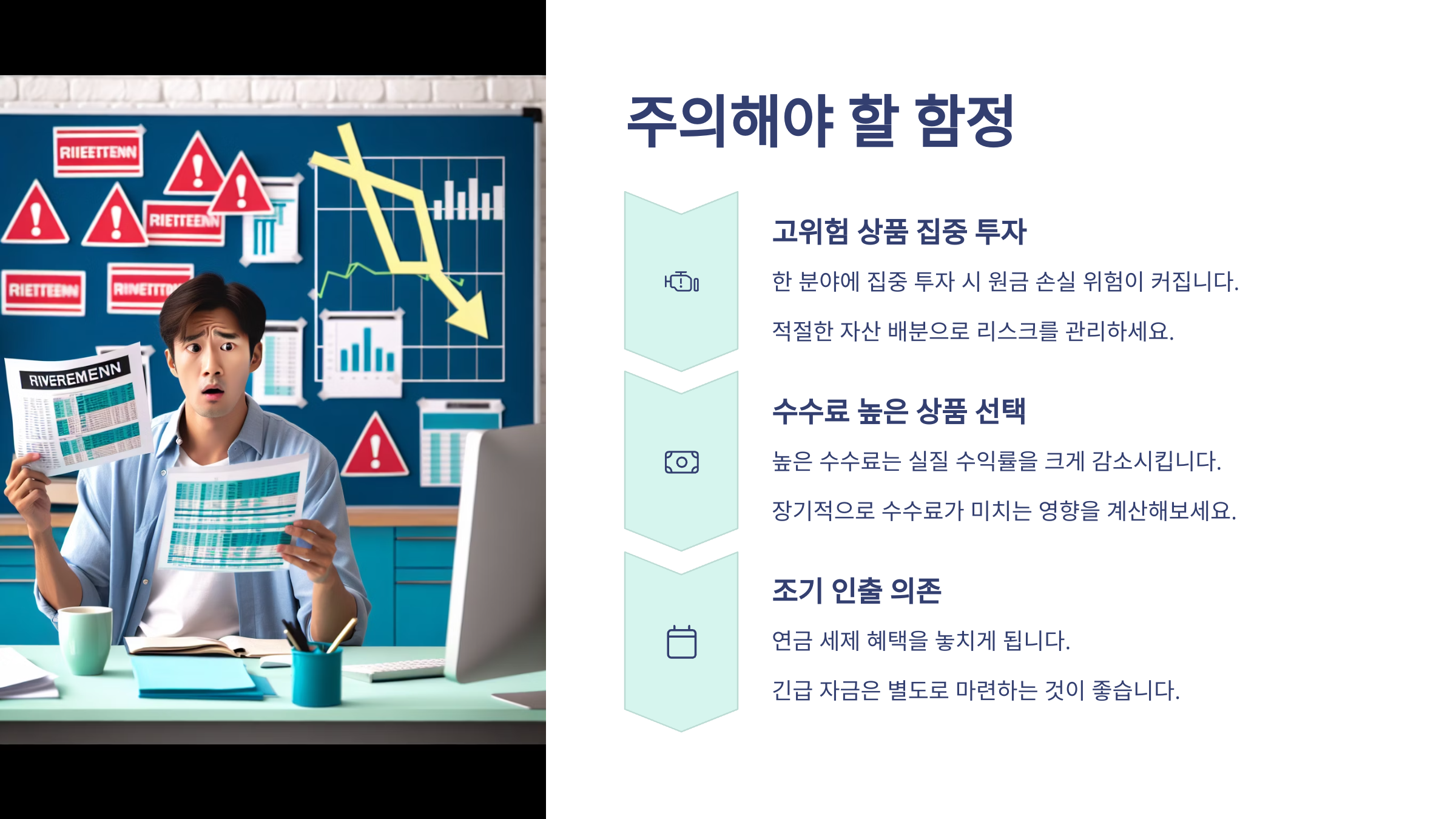 셋째는 ‘운용 방치’예요. 한 번 설정하고 몇 년간 그냥 두는 경우도 많은데, 최소한 연 1회 리밸런싱은 꼭 해야 해요.