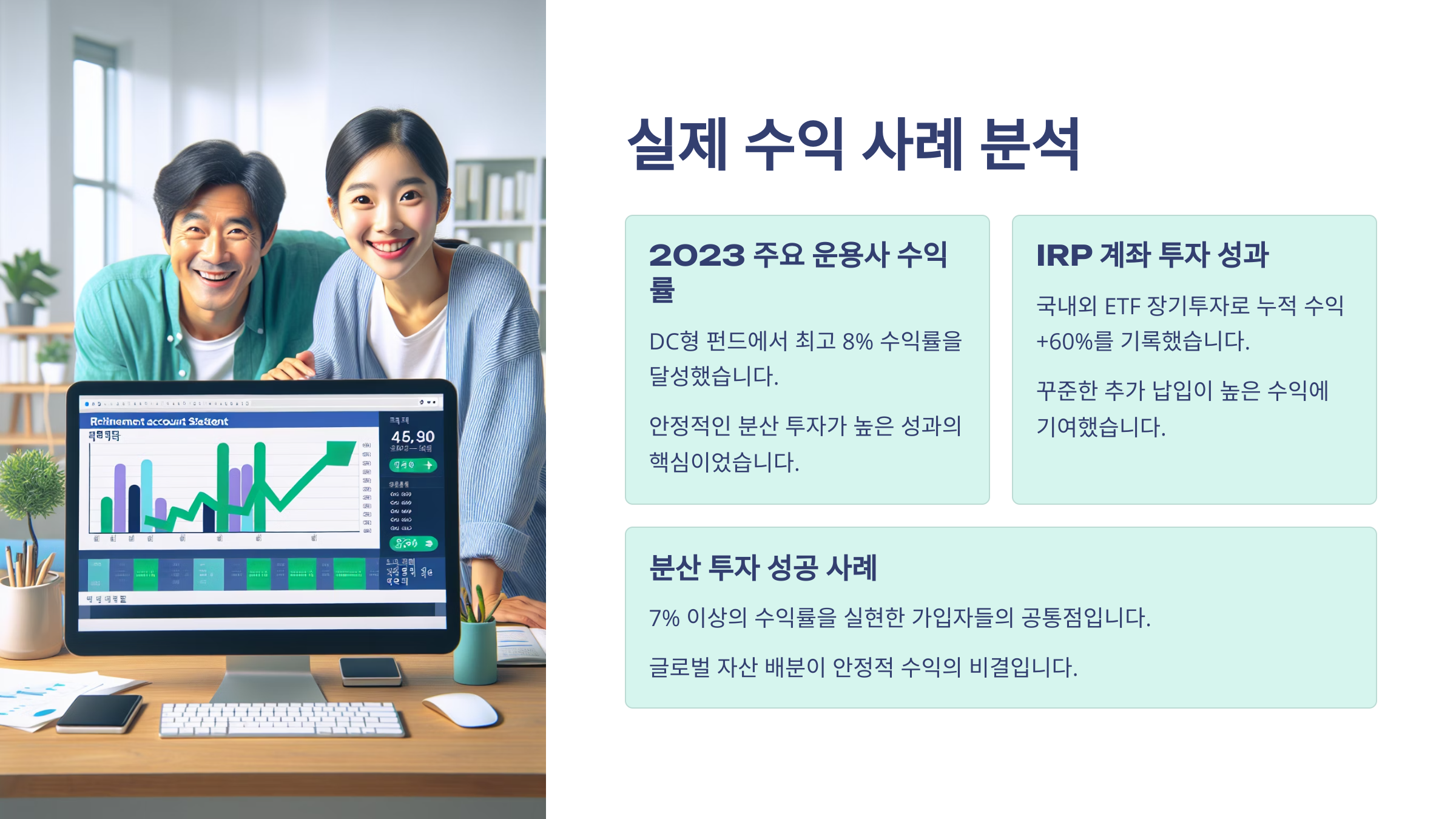 실제로 IRP 계좌에 ETF를 담아 연평균 7% 수익을 달성한 직장인도 많아요. 예를 들어 2017년부터 퇴직연금을 직접 운용한 직장인 김대리님은 S&P500 ETF와 채권 ETF를 7:3 비율로 분산 투자했어요.