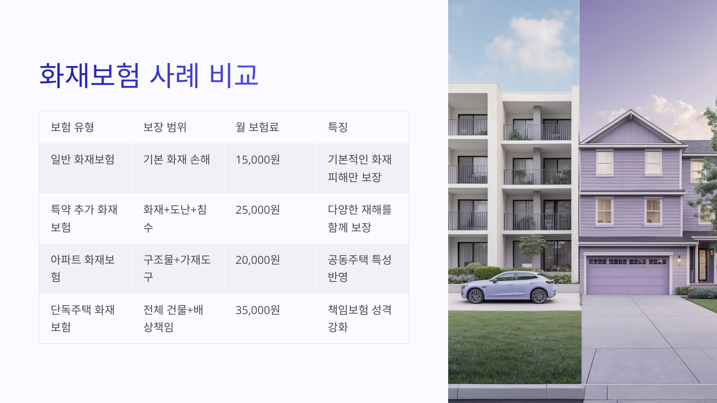 화재보험은 어떤 상품을 선택하느냐에 따라 보장 범위가 다르니까, 내 상황에 맞는 상품을 비교해보면 좋아요. 🏘️