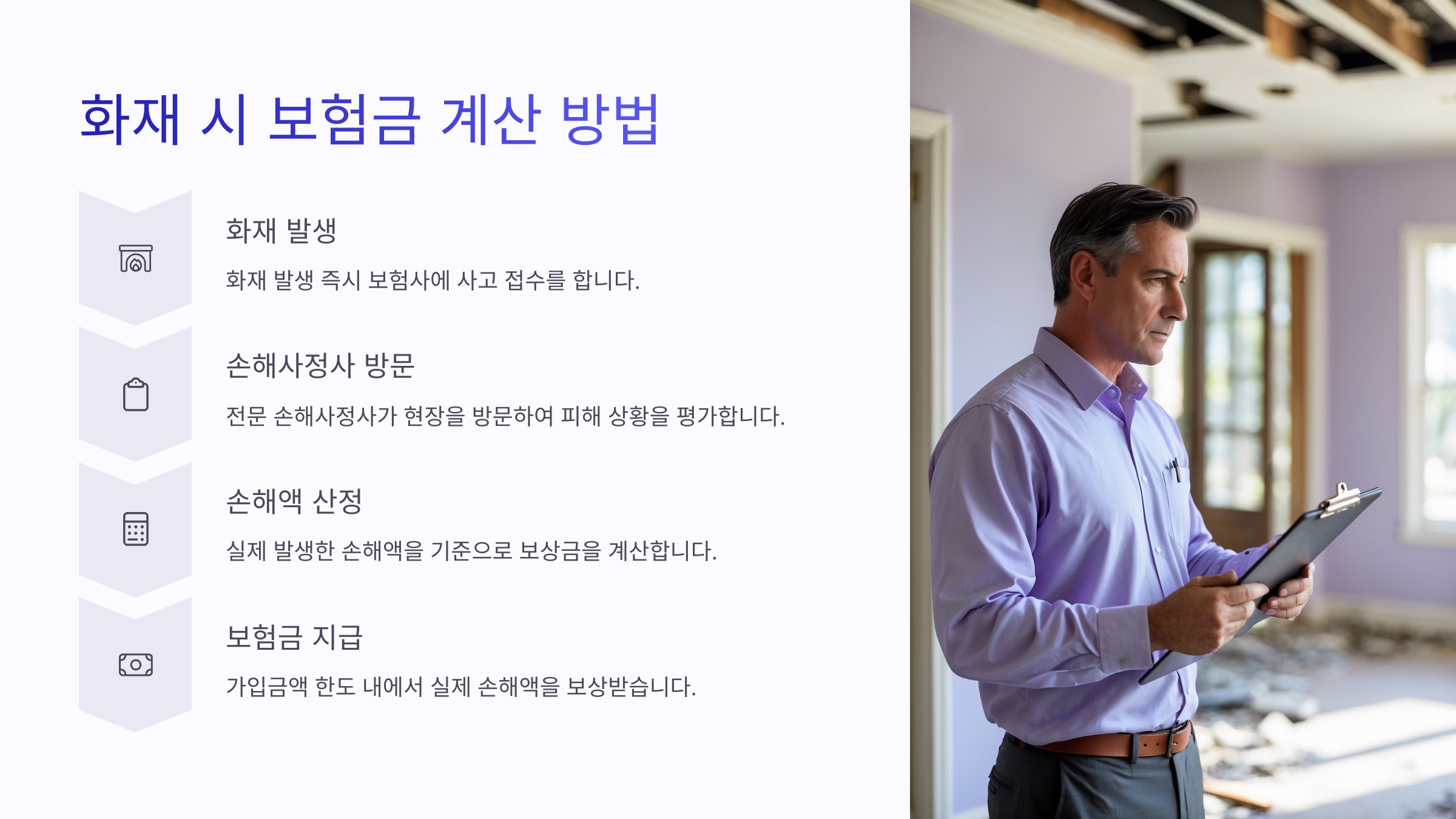 먼저, 실제 손해액을 산출해요. 화재로 인해 손실된 건물·가재도구·기타 재산의 복구 비용을 전문가가 산정하죠. 이후 이 피해액을 기준으로 보험사가 지급할 보험금을 계산해요. 보험 가입 금액을 초과하는 피해액이 있어도, 보장 한도 안에서만 보험금이 지급된다는 점을 알아둬야 해요.