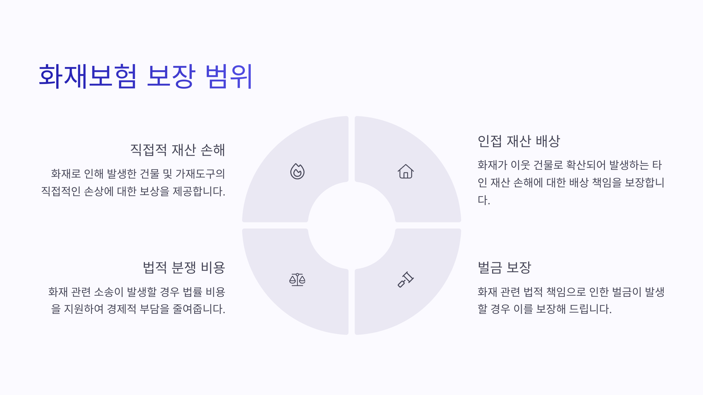 또한, 화재보험은 화재로 인한 대인·대물 배상책임까지 보장되는 경우가 있어요. 예를 들어 내 집에서 발생한 화재가 이웃집에 피해를 주면, 배상금도 보험금으로 충당할 수 있어 큰 도움이 되죠.