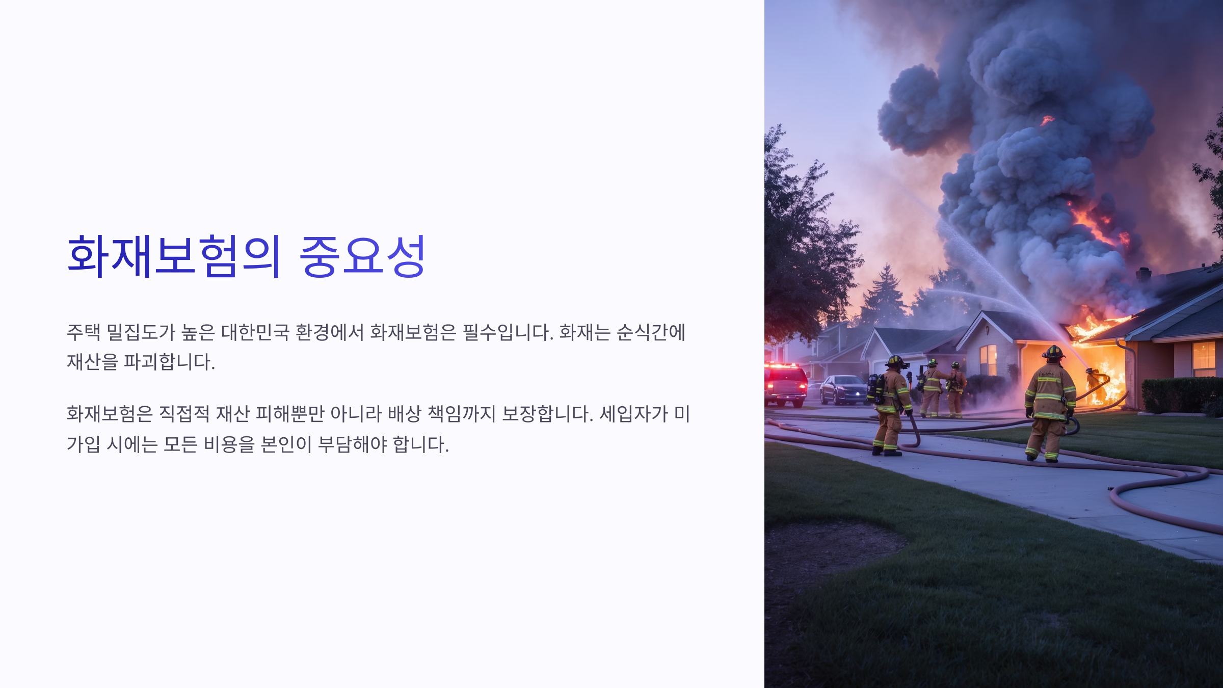화재는 누구에게나 일어날 수 있는 위험이에요. 보험은 내일을 준비하는 ‘안전한 선택’이에요! 🏘️