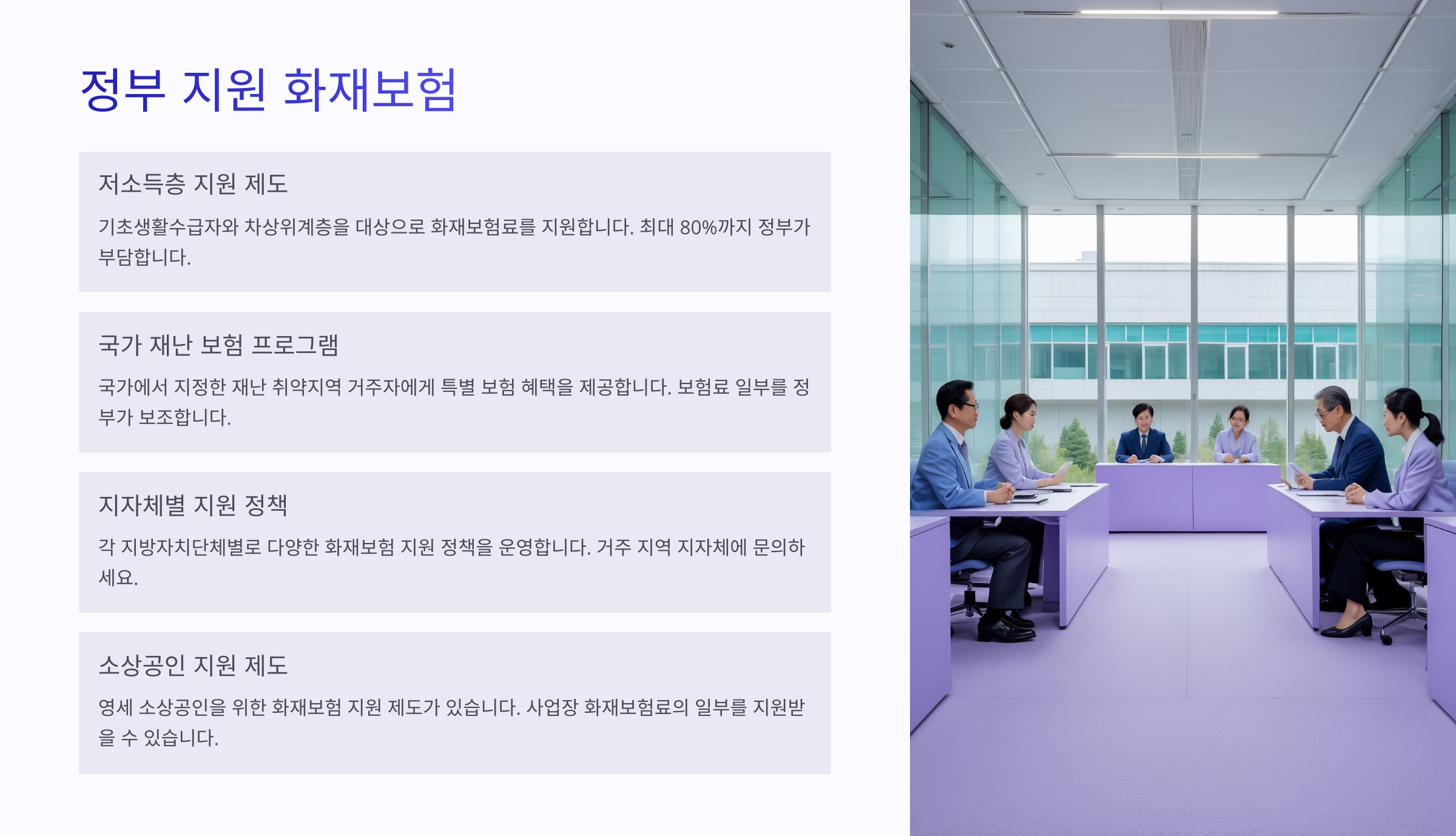 화재보험은 개인 보험도 좋지만, 정부 지원 제도를 적극 활용하면 보험료 부담도 덜고, 더 폭넓은 보장을 받을 수 있어요! 🌟