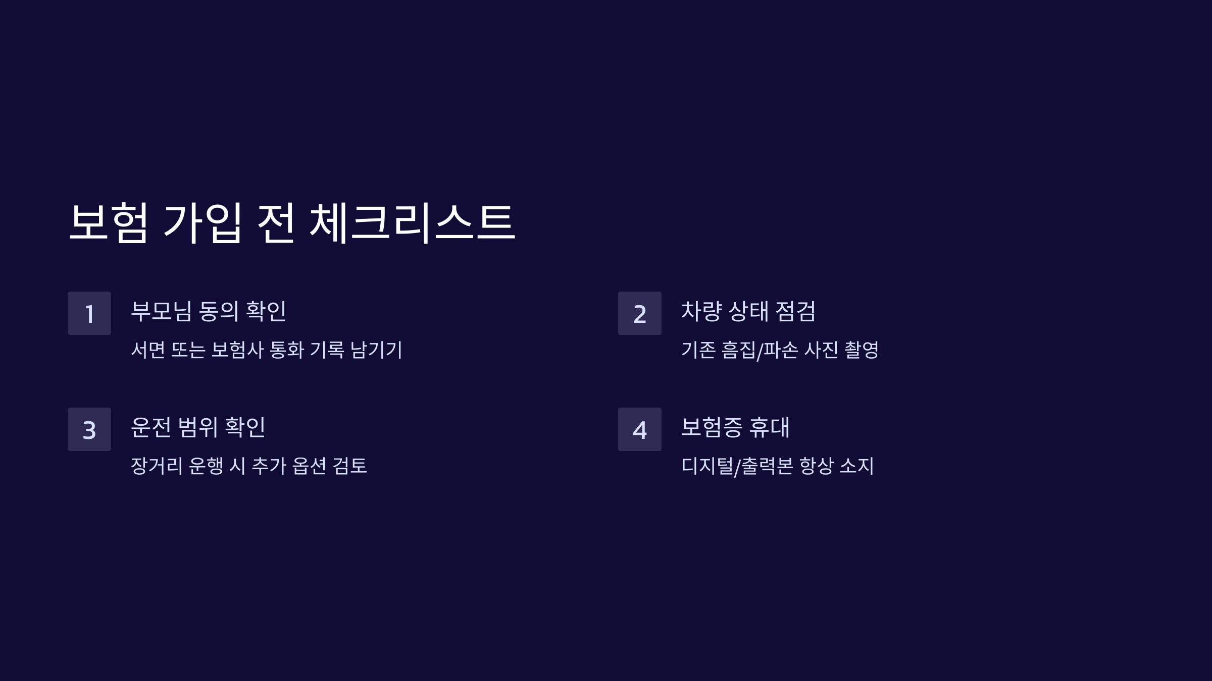 네 번째는 **차량 정보 정확성**이에요. 차량번호 한 글자라도 틀리면 보장 불가! 가입 전 꼼꼼히 입력한 정보 확인은 필수예요.