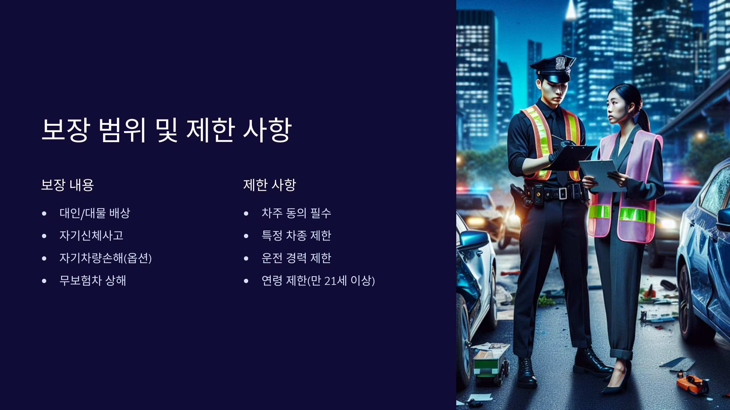 이런 제한사항들을 모르고 있다가 사고가 나면 낭패 보기 쉬워요. 꼭 약관도 꼼꼼히 읽어보시고, 차량과 운전 상황에 맞게 적절히 선택하세요!