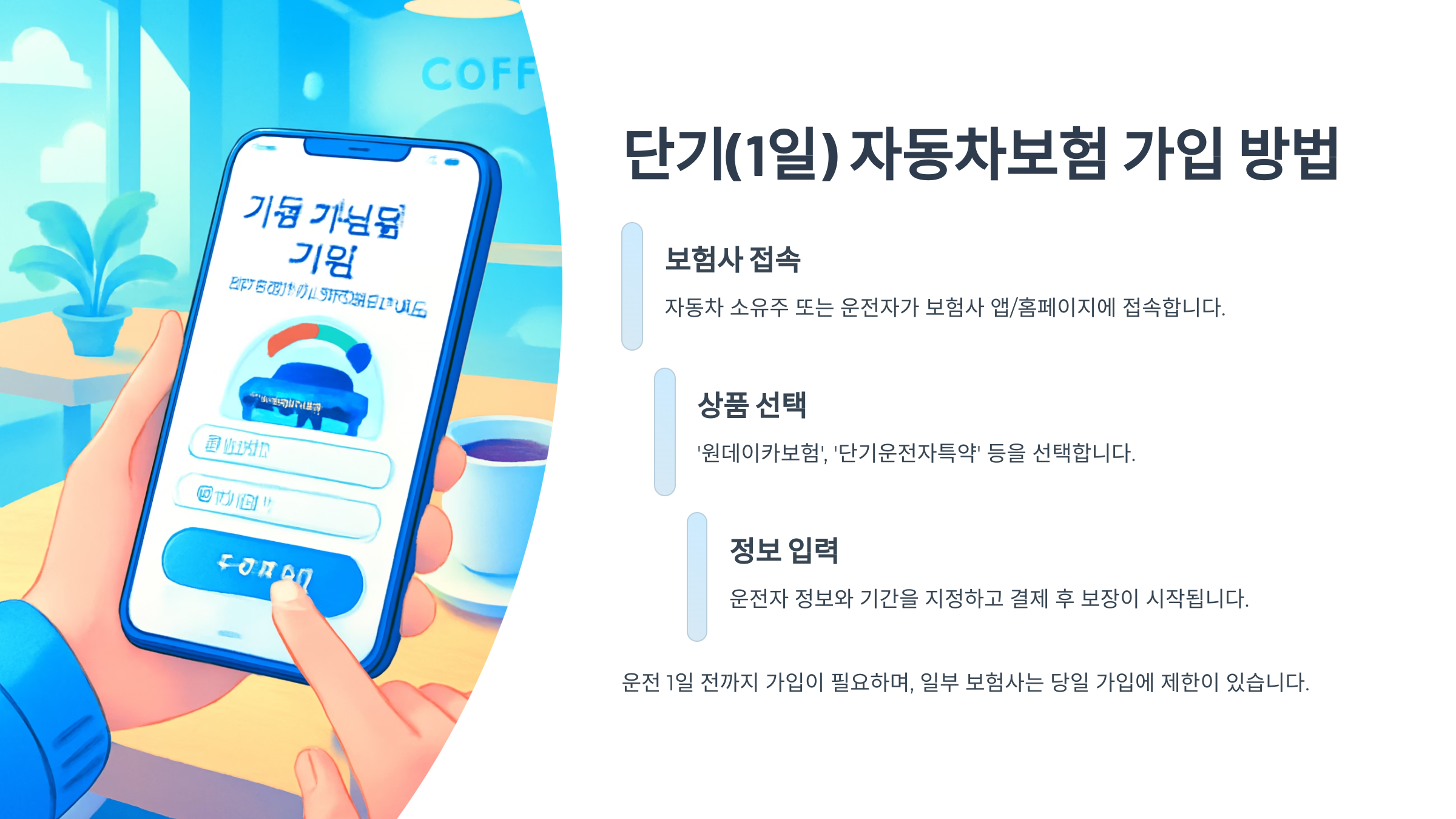 가입 방법은 매우 간단해요. 보험사 앱이나 포털에서 '1일 자동차보험'을 검색하고, 차량번호, 운전자 정보, 이용 기간(보통 1~7일 선택 가능)을 입력하면 끝이에요. 본인 인증만으로 바로 개시돼요.