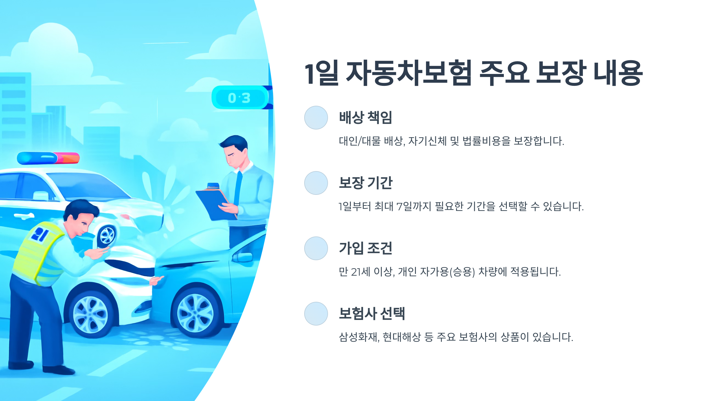 단기 자동차보험, 즉 ‘1일 자동차보험’은 이름 그대로 하루 동안 자동차 사고에 대비할 수 있는 임시 보험이에요. 대부분 운전자 본인의 사고 책임을 커버해주고, 사고 상대방의 피해에 대한 보상도 포함돼요.
