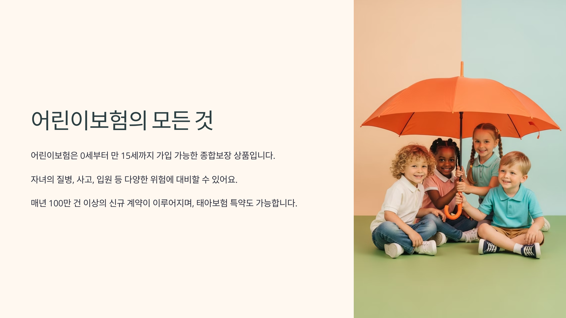 이러한 위험에 대비하기 위해 보험사들은 0세부터 가입 가능한 어린이보험 상품을 출시한 거예요. 즉, 아기가 태어나는 순간부터 ‘위험 보장’이 필요한 시기라고 보는 거죠.