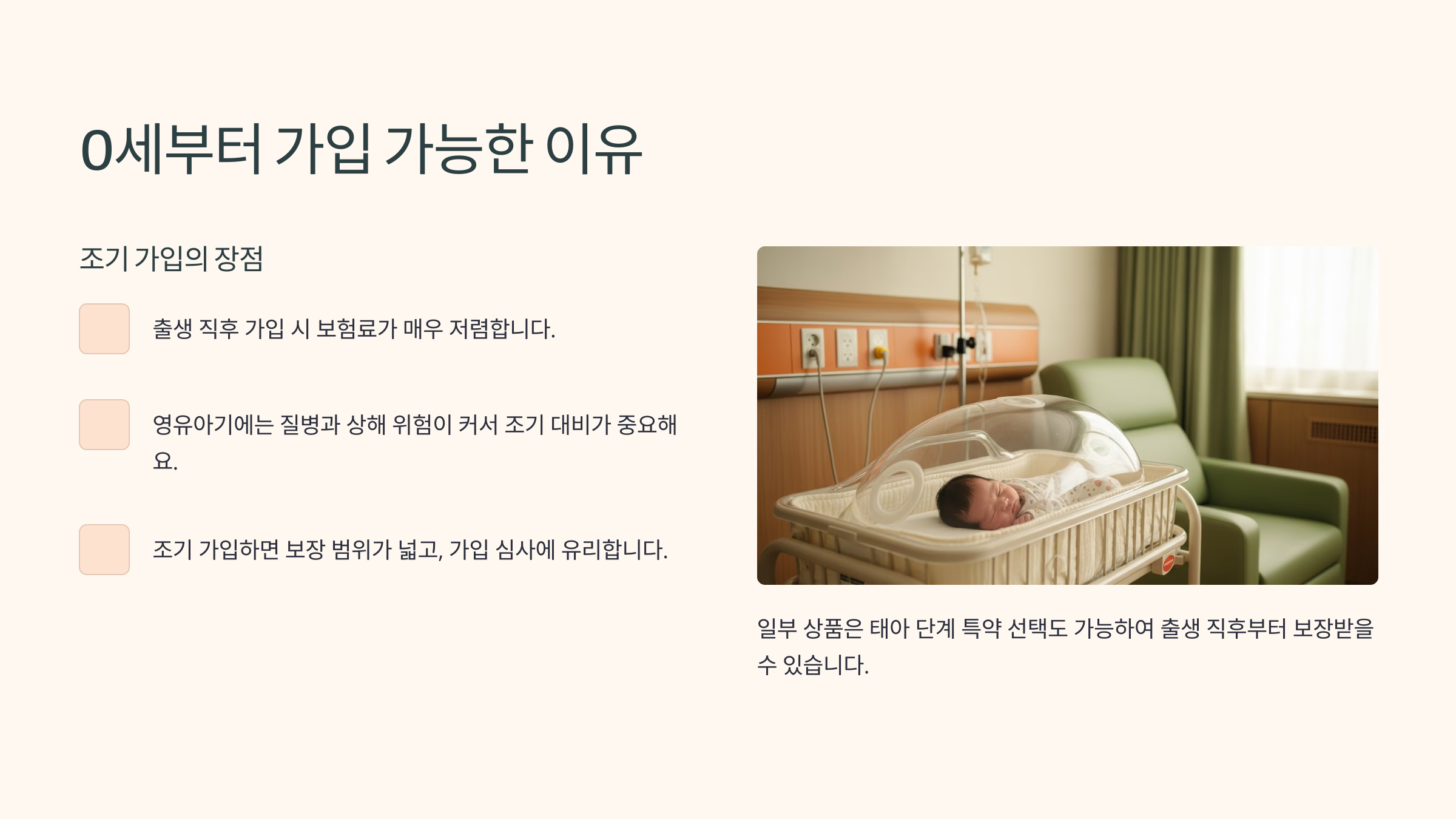 많은 부모님들이 놀라는 부분 중 하나가 "어린이보험이 생후 0일부터 가입 가능하다"는 점이에요. 아직 아무 질병도 없는 갓난아기가 왜 보험이 필요한 걸까요?