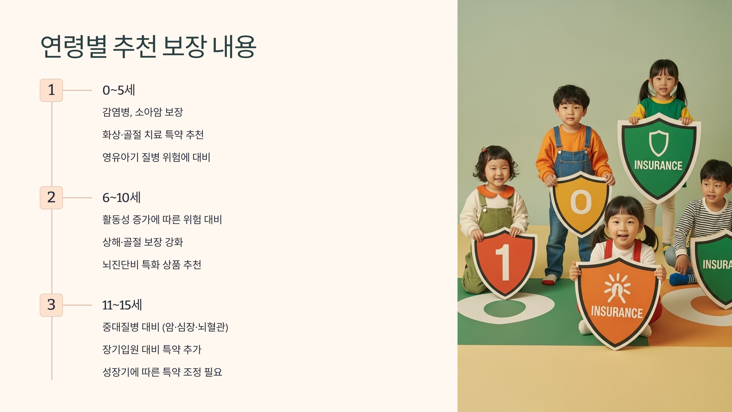 처음에는 단순히 감기나 폐렴 같은 가벼운 질병부터 시작되지만, 성장하면서 발생할 수 있는 장기적인 질환이나 사고까지 대비할 수 있어요.