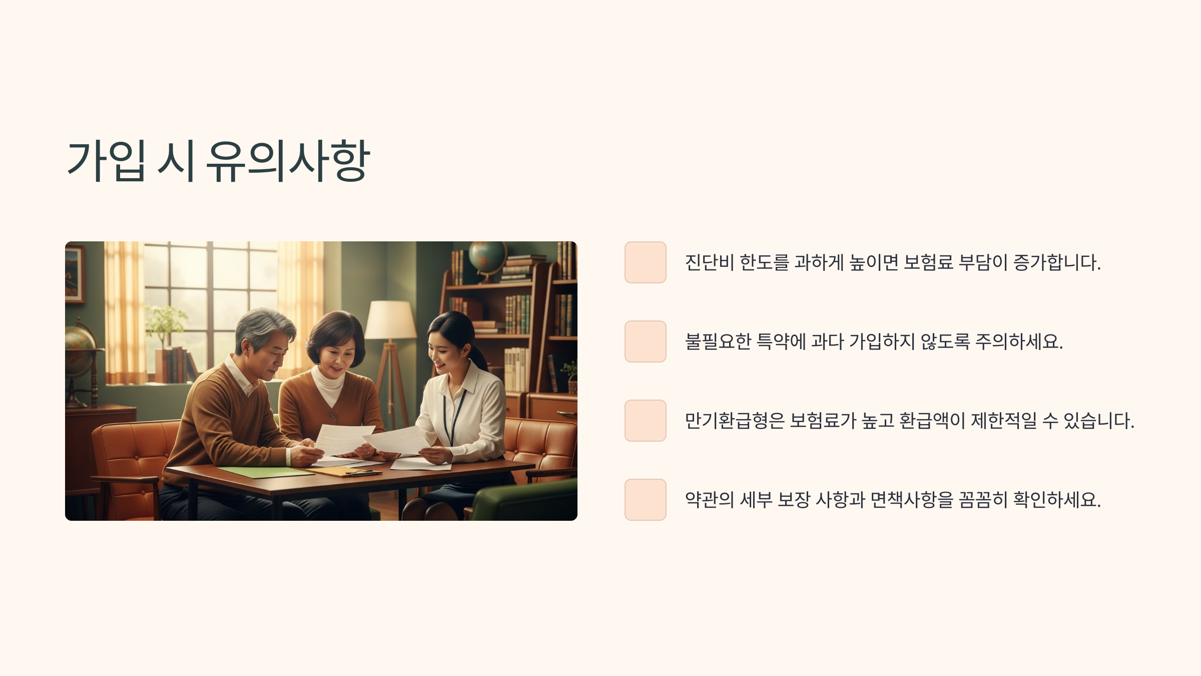 먼저 중요한 건 **보장 범위와 보험료의 균형**이에요. 보장 내용은 좋은데 보험료가 지나치게 비싸면 유지가 어려워지고, 반대로 보험료가 싸기만 하면 보장이 부족할 수 있어요.