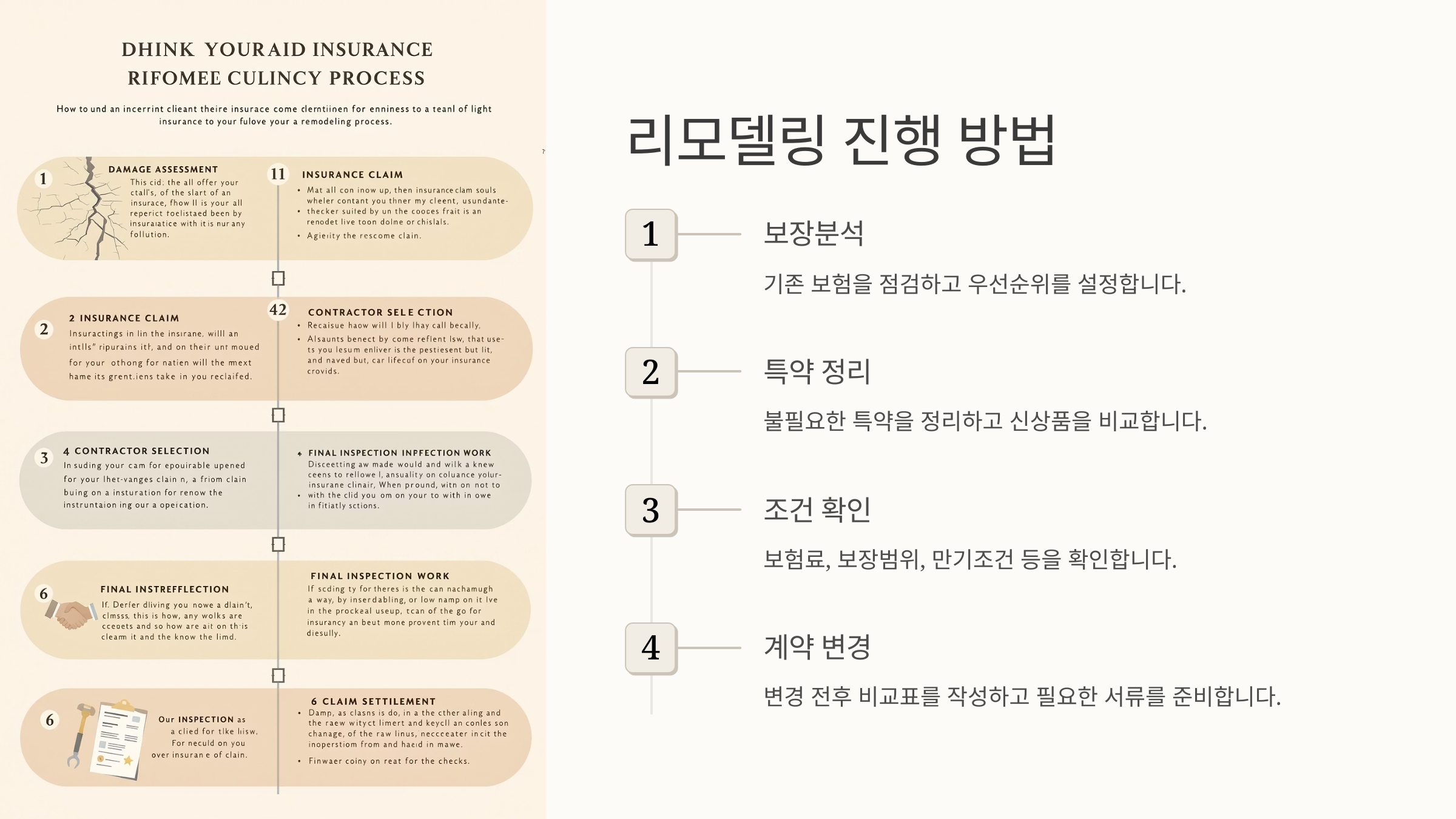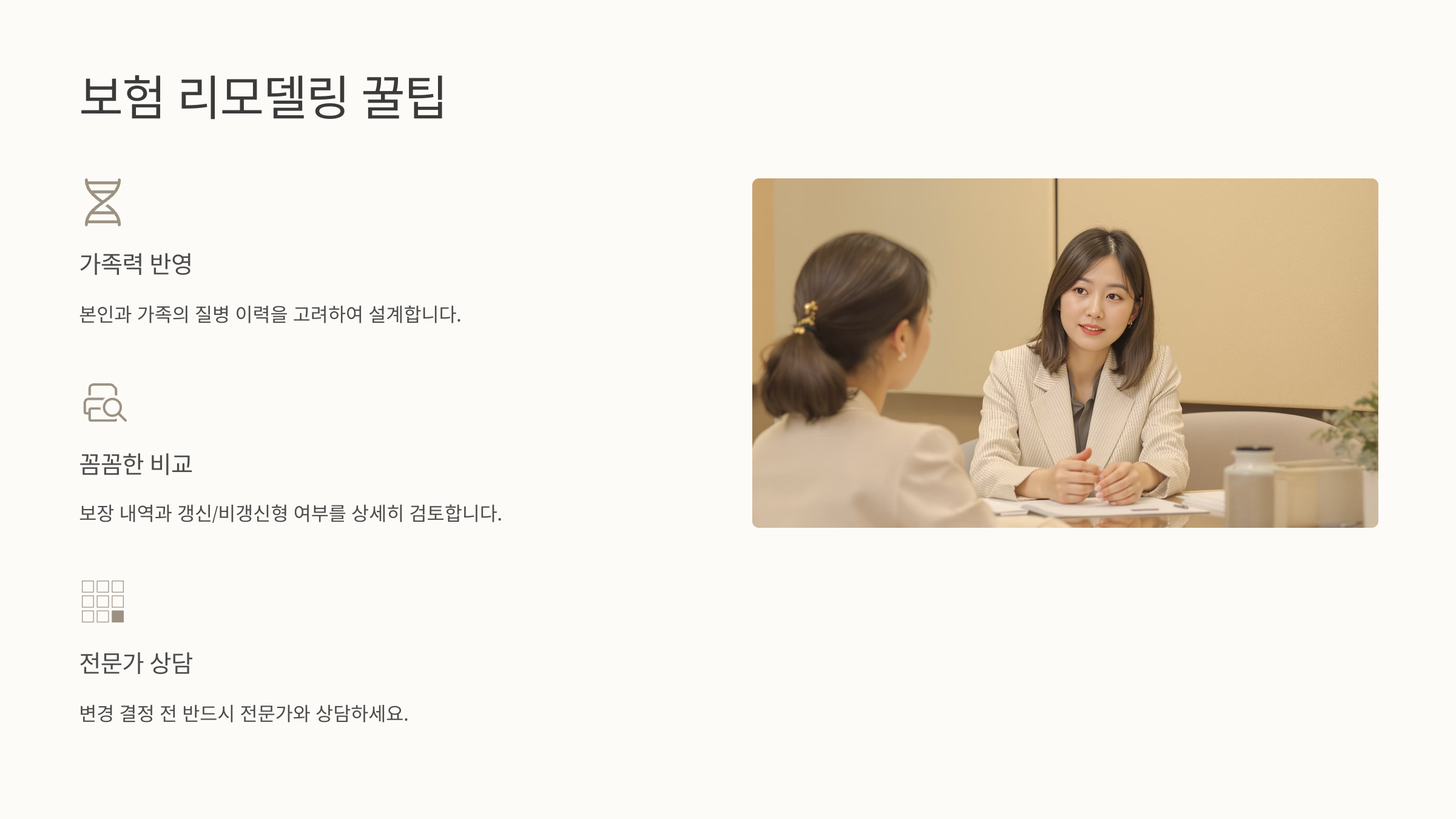 여섯 번째로는, **상담사 권유에 무조건 따르지 말고 스스로 비교 분석**하는 게 중요해요. 리모델링을 명목으로 불필요한 보험을 더 늘리려는 경우도 있거든요. 그래서 반드시 여러 설계안을 받아보고, 내가 직접 비교하고 판단해야 해요. 📝